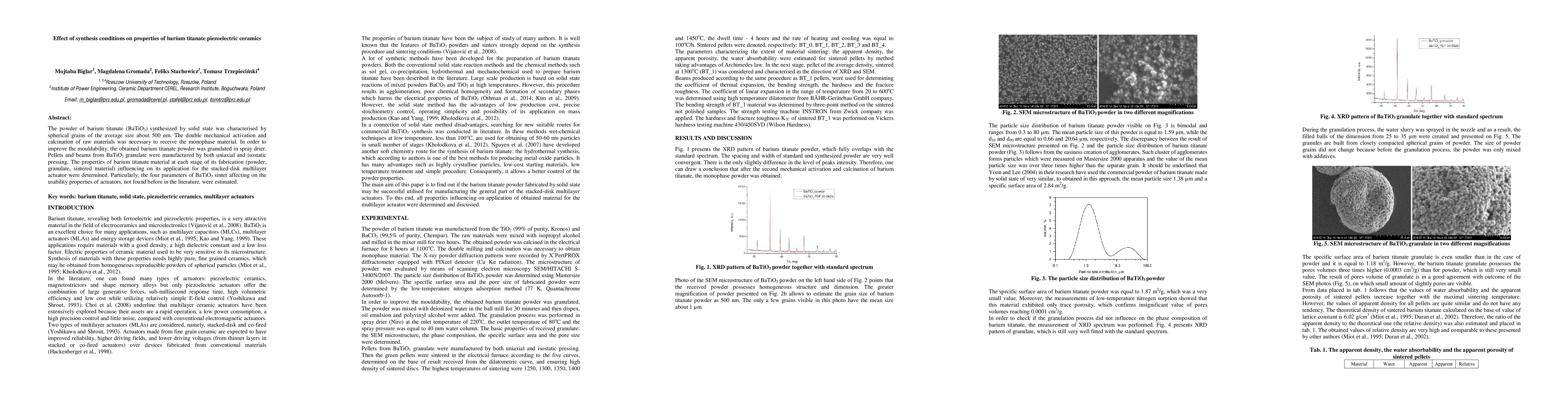 The powder of barium titanate (BaTiO3) synthesized by solid state was characterised by spherical grains of the average size about 500 nm. The double mechanical activation and calcination of raw materials was necessary to receive the monophase material. In order to improve the mouldability, the obtained barium titanate powder was granulated in spray drier. Pellets and beams from BaTiO3 granulate were manufactured by both uniaxial and isostatic pressing. The properties of barium titanate material at each stage of its fabrication (powder, granulate, sintered material) influencing on its application for the stacked-disk multilayer actuator were determined. Particularly, the four parameters of BaTiO3 sinter affecting on the usability properties of actuators, not found before in the literature, were estimated.