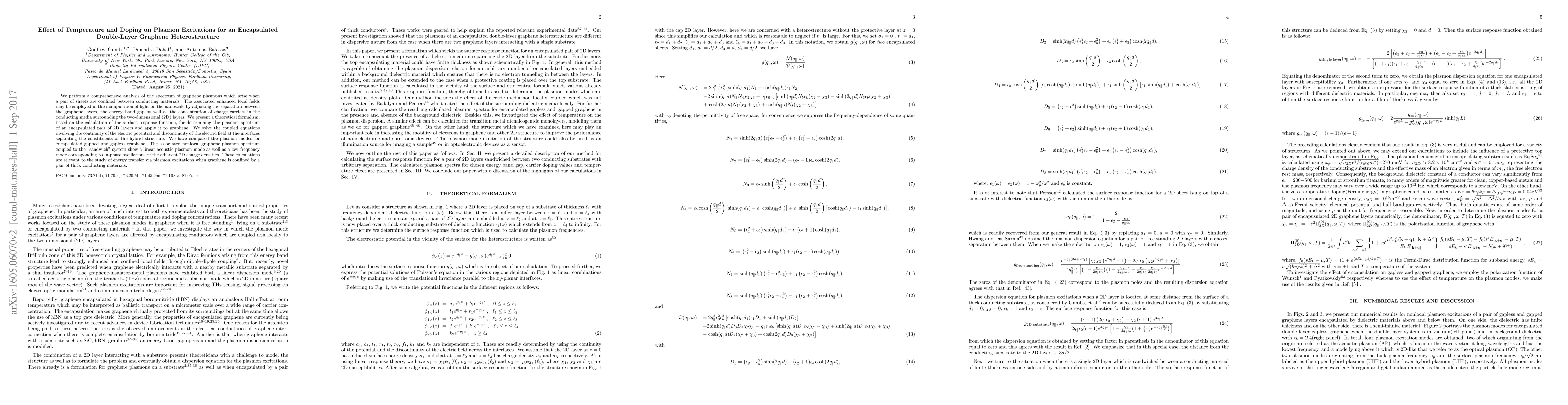 We perform a comprehensive analysis of the spectrum of graphene plasmons which arise when a pair of sheets are confined between conducting materials. The associated enhanced local fields may be employed in the manipulation of light on the nanoscale by adjusting the separation between the graphene layers, the energy band gap as well as the concentration of charge carriers in the conducting media surrounding the two-dimensional (2D) layers. We present a theoretical formalism, based on the calculation of the surface response function, for determining the plasmon spectrum of an encapsulated pair of 2D layers and apply it to graphene. We solve the coupled equations involving the continuity of the electric potential and discontinuity of the electric field at the interfaces separating the constituents of the hybrid structure. We have compared the plasmon modes for encapsulated gapped and gapless graphene. The associated nonlocal graphene plasmon spectrum coupled to the "sandwich" system show a linear acoustic plasmon mode as well as a low-frequency mode corresponding to in-phase oscillations of the adjacent 2D charge densities. These calculations are relevant to the study of energy transfer via plasmon excitations when graphene is confined by a pair of thick conducting materials.