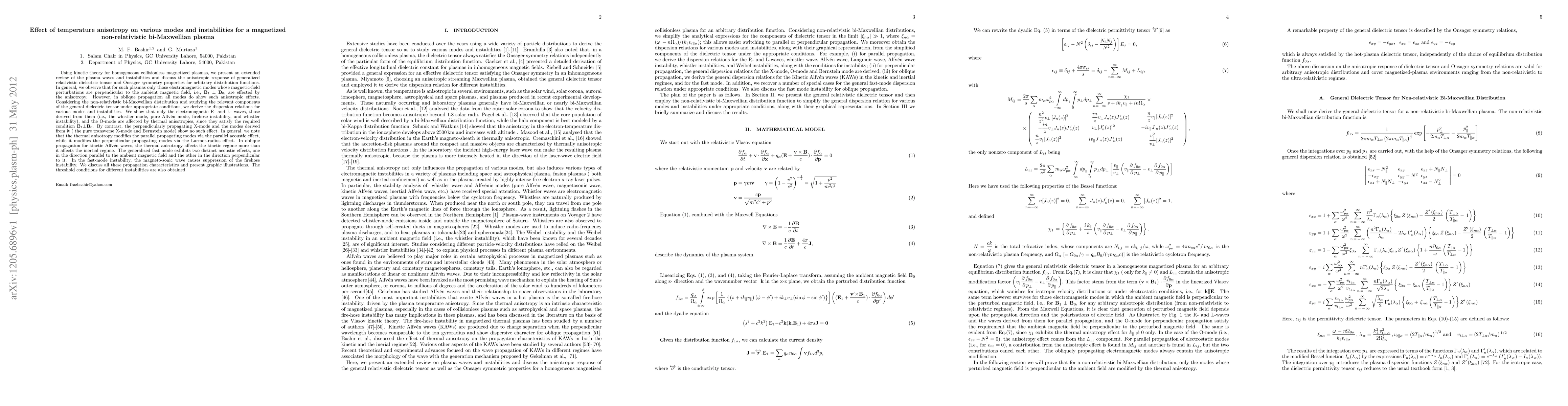 Using kinetic theory for homogeneous collisionless magnetized plasmas, we present an extended review of the plasma waves and instabilities and discuss the anisotropic response of generalized relativistic dielectric tensor and Onsager symmetry properties for arbitrary distribution functions. In general, we observe that for such plasmas only those electromagnetic modes whose magnetic field perturbations are perpendicular to the ambient magneticeld, i.e.,B1 \perp B0, are effected by the anisotropy. However, in oblique propagation all modes do show such anisotropic effects. Considering the non-relativistic bi-Maxwellian distribution and studying the relevant components of the general dielectric tensor under appropriate conditions, we derive the dispersion relations for various modes and instabilities. We show that only the electromagnetic R- and L- waves, those derived from them and the O-mode are affected by thermal anisotropies, since they satisfy the required condition B1\perpB0. By contrast, the perpendicularly propagating X-mode and the modes derived from it (the pure transverse X-mode and Bernstein mode) show no such effect. In general, we note that the thermal anisotropy modifies the parallel propagating modes via the parallel acoustic effect, while it modifies the perpendicular propagating modes via the Larmor-radius effect. In oblique propagation for kinetic Alfven waves, the thermal anisotropy affects the kinetic regime more than it affects the inertial regime. The generalized fast mode exhibits two distinct acoustic effects, one in the direction parallel to the ambient magnetic field and the other in the direction perpendicular to it. In the fast-mode instability, the magneto-sonic wave causes suppression of the firehose instability. We discuss all these propagation characteristics and present graphic illustrations.