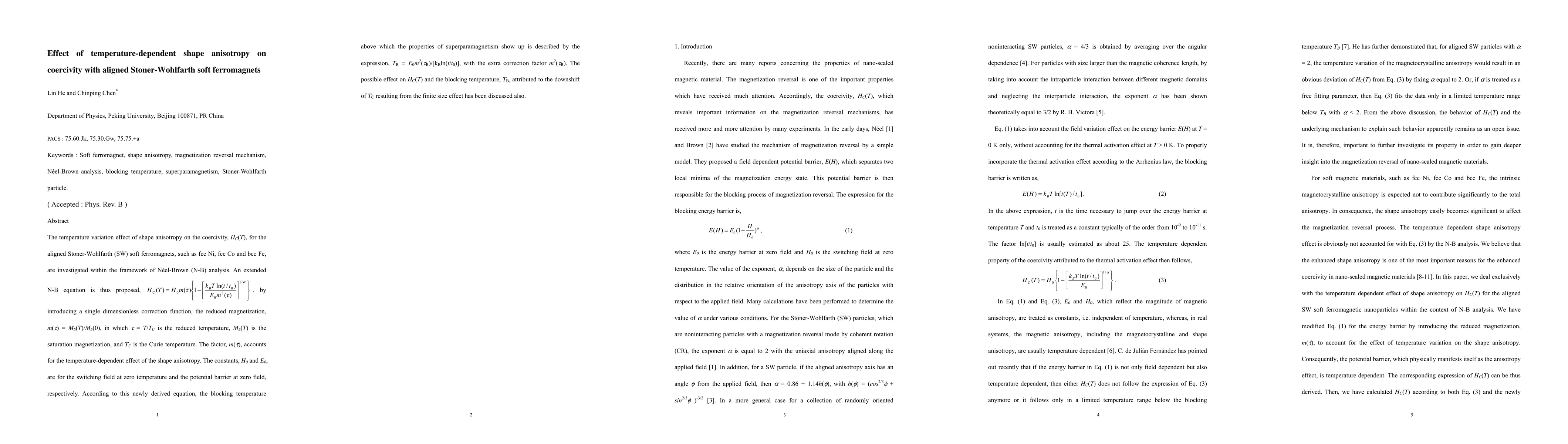 The temperature variation effect of shape anisotropy on the coercivity, HC(T), for the aligned Stoner-Wohlfarth (SW) soft ferromagnets, such as fcc Ni, fcc Co and bcc Fe, are investigated within the framework of Neel-Brown (N-B) analysis. An extended N-B equation is thus proposed,by introducing a single dimensionless correction function, the reduced magnetization, m(\tao) = MS(T)/MS(0), in which \tao = T/TC is the reduced temperature, MS(T) is the saturation magnetization, and TC is the Curie temperature. The factor, m(\tao), accounts for the temperature-dependent effect of the shape anisotropy. The constants, H0 and E0, are for the switching field at zero temperature and the potential barrier at zero field, respectively. According to this newly derived equation, the blocking temperature above which the properties of superparamagnetism show up is described by the expression, TB = E0m^2(\tao)/[kBln(t/t0)], with the extra correction factor m^2(\tao). The possible effect on HC(T) and the blocking temperature, TB, attributed to the downshift of TC resulting from the finite size effect has been discussed also.