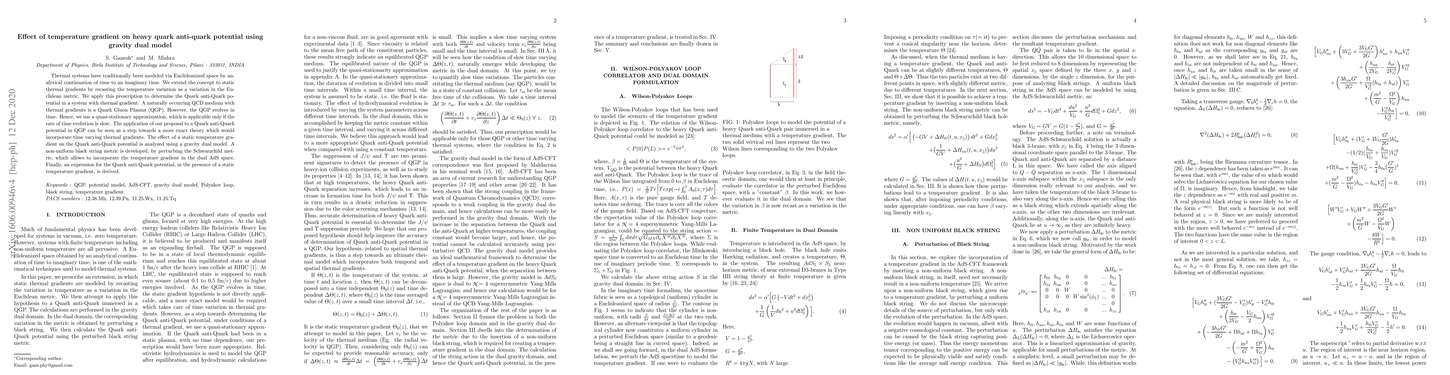 Thermal systems have traditionally been modeled via Euclideanized space by analytical continuation of time to an imaginary time. We extend the concept to static thermal gradients by recasting the temperature variation as a variation in the Euclidean metric. We apply this prescription to determine the Quark anti-Quark potential in a system with thermal gradient. A naturally occurring QCD medium with thermal gradients is a Quark Gluon Plasma (QGP). However, the QGP evolves in time. Hence, we use a quasi-stationary approximation, which is applicable only if the rate of time evolution is slow. The application of our proposal to a Quark anti-Quark potential in QGP can be seen as a step towards a more exact theory which would incorporate time varying thermal gradients. The effect of a static temperature gradient on the Quark anti-Quark potential is analyzed using a gravity dual model. A non-uniform black string metric is developed, by perturbing the Schwarzchild metric, which allows to incorporate the temperature gradient in the dual AdS space. Finally, an expression for the Quark anti-Quark potential, in the presence of a static temperature gradient, is derived.