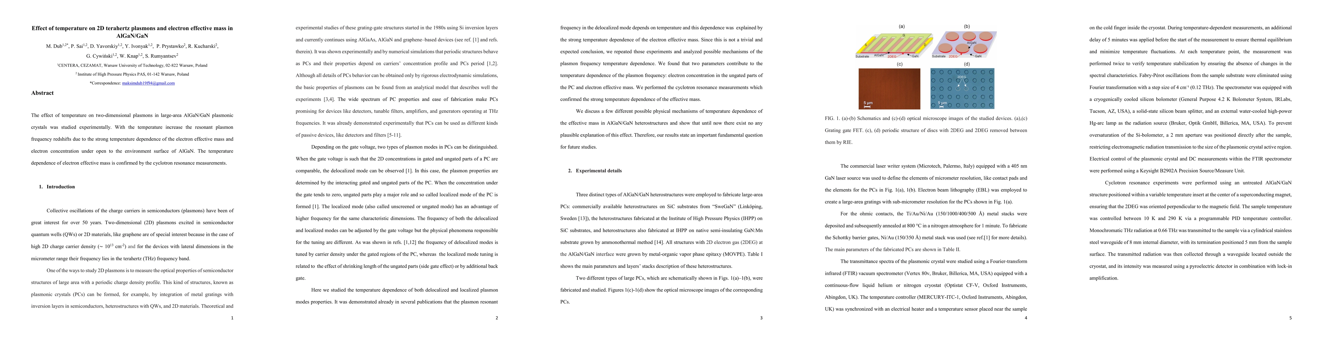 Uniquely confirms temperature dependence of electron effective mass in AlGaN/GaN systems using both plasmonic and cyclotron resonance measurements.