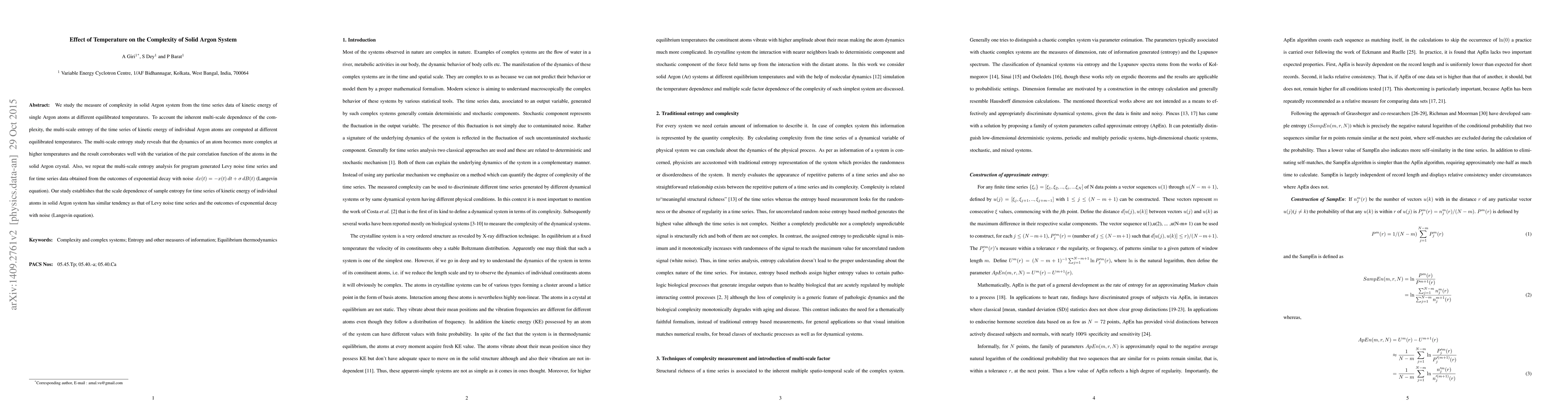 We study the measure of complexity in solid Argon system from the time series data of kinetic energy of single Argon atoms at different equilibrated temperatures. To account the inherent multi-scale dependence of the complexity, the multi-scale entropy of the time series of kinetic energy of individual Argon atoms are computed at different equilibrated temperatures. The multi-scale entropy study reveals that the dynamics of an atom becomes more complex at higher temperatures and the result corroborates well with the variation of the pair correlation function of the atoms in the solid Argon crystal. Also, we repeat the multi-scale entropy analysis for program generated Levy noise time series and for time series data obtained from the outcomes of exponential decay with noise dx(t) = -x(t) dt + sigma dB(t) (Langevin equation). Our study establishes that the scale dependence of sample entropy for time series of kinetic energy of individual atoms in solid Argon system has similar tendency as that of Levy noise time series and the outcomes of exponential decay with noise (Langevin equation).