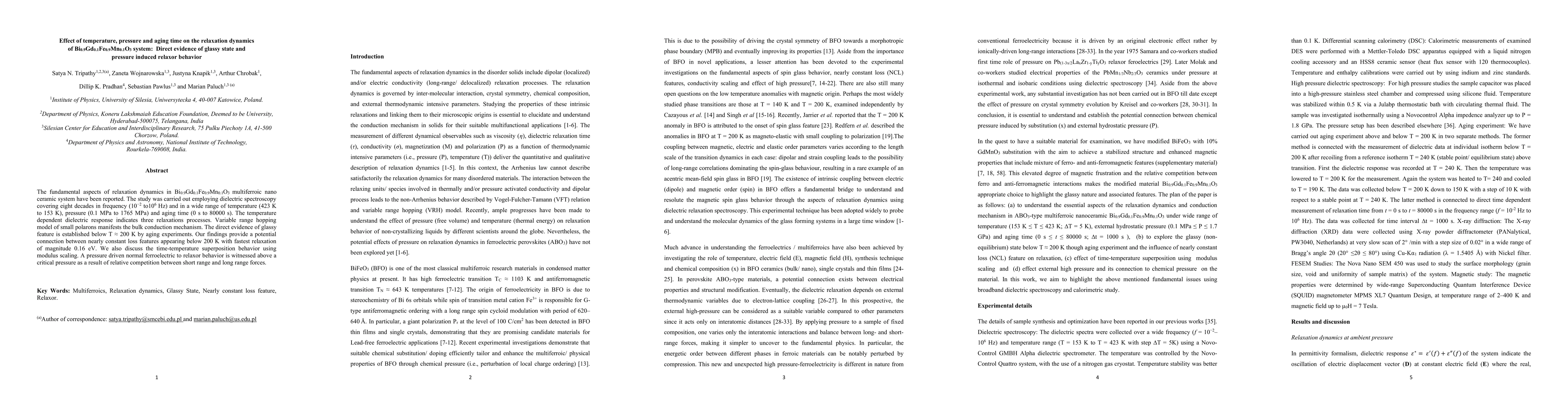 The fundamental aspects of relaxation dynamics in Bi0.9Gd0.1Fe0.9Mn0.1O3 multiferroic system have been reported. The study was carried out employing dielectric relaxation spectroscopy covering eight decades in frequency 0.01 to106 Hz and in a wide range of temperature 423 K to 153 K, hydrostatic pressure 0.1 MPa to 1765 MPa and aging time 0 s to 80000 s. The temperature dependent dielectric response indicates three relaxations processes in the dynamic window of modulus formalism. Variable range hopping model of small polarons manifests the bulk conduction mechanism. The bulk and grain boundary contributions have been estimated using impedance spectroscopy analysis and reveal that localized process dominates the relaxation. The direct evidence of glassy feature is established below 200 K by aging experiments. Our findings provide a potential connection between nearly constant loss features appearing below 200 K with fastest relaxation of magnitude 0.16 eV. We also discuss the time temperature superposition behavior using modulus scaling. A pressure driven normal ferroelectric to relaxor behavior is witnessed above a critical pressure as a result of relative competition between short range and long range forces. Our findings focus the role of high pressure as a fundamental bridge between normal ferroelectrics and relaxors. Intriguingly, there exists a direct connection between chemical pressure induced by substitution and external hydrostatic pressure. These findings have robust fundamental importance on theoretical elucidation of relaxation dynamics in perovskite systems.