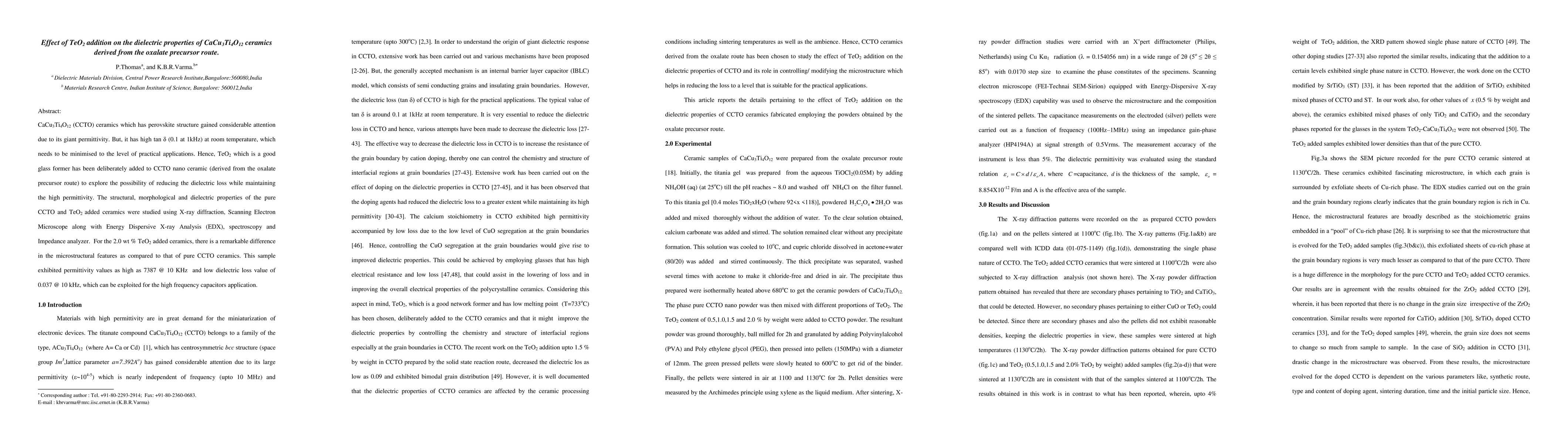 This study investigates the effect of TeO2 addition on CaCu3Ti4O12 ceramics derived from the oxalate precursor route, aiming to reduce dielectric loss while preserving high permittivity. The 2.0 wt% TeO2-added ceramics showed significant microstructural changes, high permittivity of 7387 @ 10 kHz, and low dielectric loss of 0.037 @ 10 kHz, making them suitable for high-frequency capacitor applications.