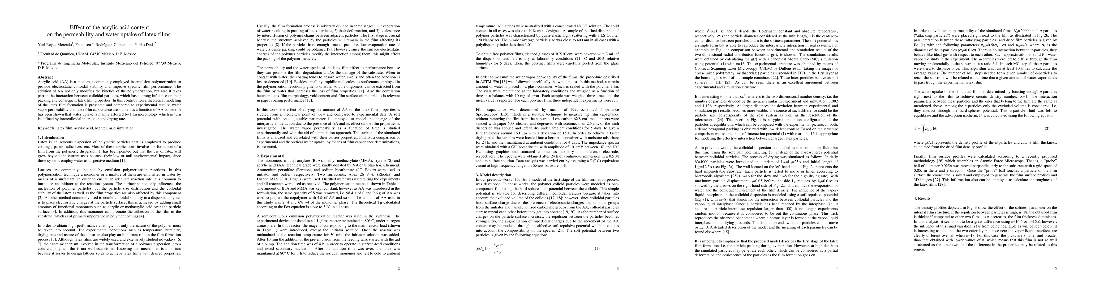 Acrylic acid (AA) is a monomer commonly employed in emulsion polymerization to provide electrostatic colloidal stability and improve specific film performance. The addition of AA not only modifies the kinetics of the polymerization, but also it takes part in the interaction between colloidal particles, which has a strong influence on their packing and consequent latex film properties. In this contribution a theoretical modeling of the latex film formation is presented and compared to experimental results: water vapor permeability and latex film capacitance are studied as a function of AA content. It has been shown that water uptake is mainly affected by film morphology which in turn is defined by intercolloidal interaction and drying rate.