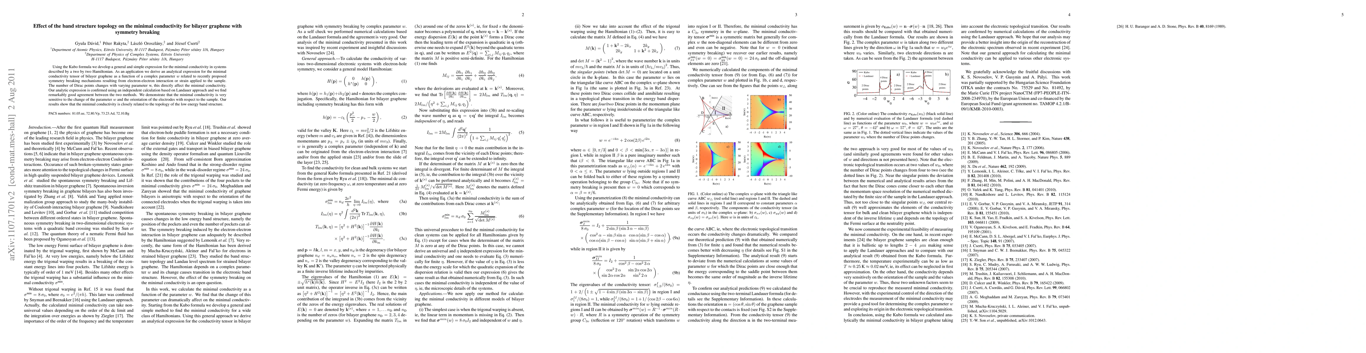 Using the Kubo formula we develop a general and simple expression for the minimal conductivity in systems described by a two by two Hamiltonian. As an application we derive an analytical expression for the minimal conductivity tensor of bilayer graphene as a function of a complex parameter $w$ related to recently proposed symmetry breaking mechanisms resulting from electron-electron interaction or strain applied to the sample. The number of Dirac points changes with varying parameter w, this directly affect the minimal conductivity. Our analytic expression is confirmed using an independent calculation based on Landauer approach and we find remarkably good agreement between the two methods. We demonstrate that the minimal conductivity is very sensitive to the change of the parameter $w$ and the orientation of the electrodes with respect to the sample. Our results show that the minimal conductivity is closely related to the topology of the low energy band structure.