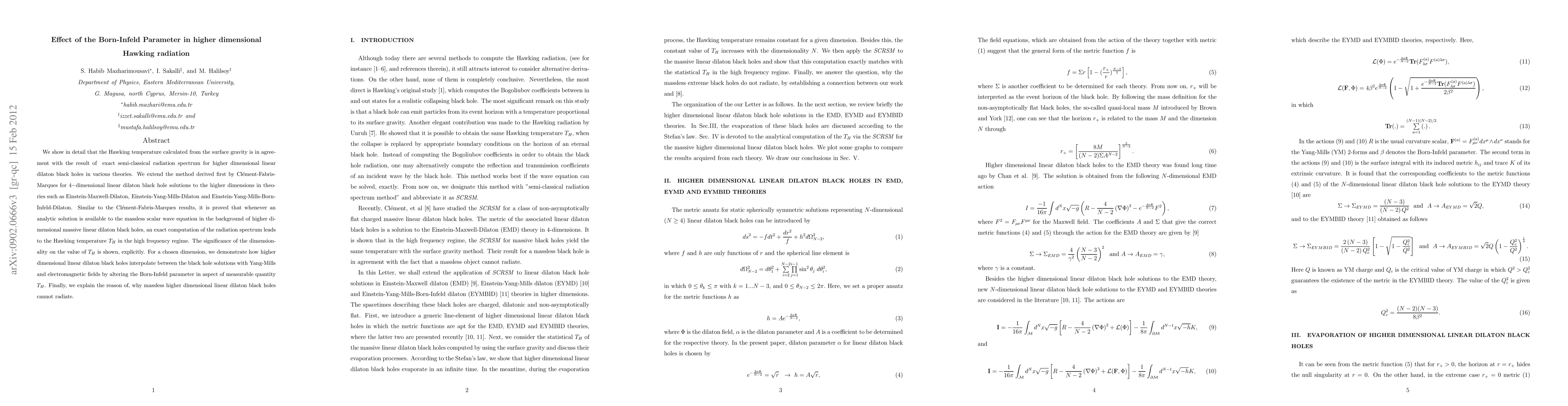 This paper investigates the impact of the Born-Infeld parameter on Hawking radiation in higher-dimensional black holes with linear dilaton backgrounds, confirming the Hawking temperature matches exact semi-classical computations across various theories. It shows higher dimensions interpolate between electromagnetic and Yang-Mills field solutions via the Born-Infeld parameter affecting Hawking temperature.