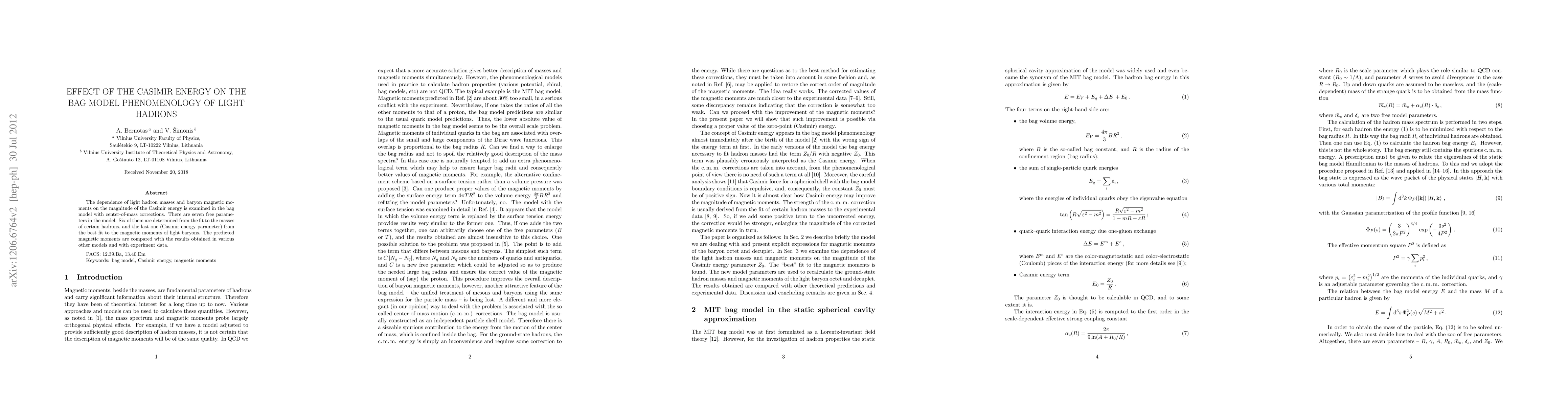 The dependence of light hadron masses and baryon magnetic moments on the magnitude of the Casimir energy is examined in the bag model with center-of-mass corrections. There are seven free parameters in the model. Six of them are determined from the fit to the masses of certain hadrons, and the last one (Casimir energy parameter) from the best fit to the magnetic moments of light baryons. The predicted magnetic moments are compared with the results obtained in various other models and with experiment data.