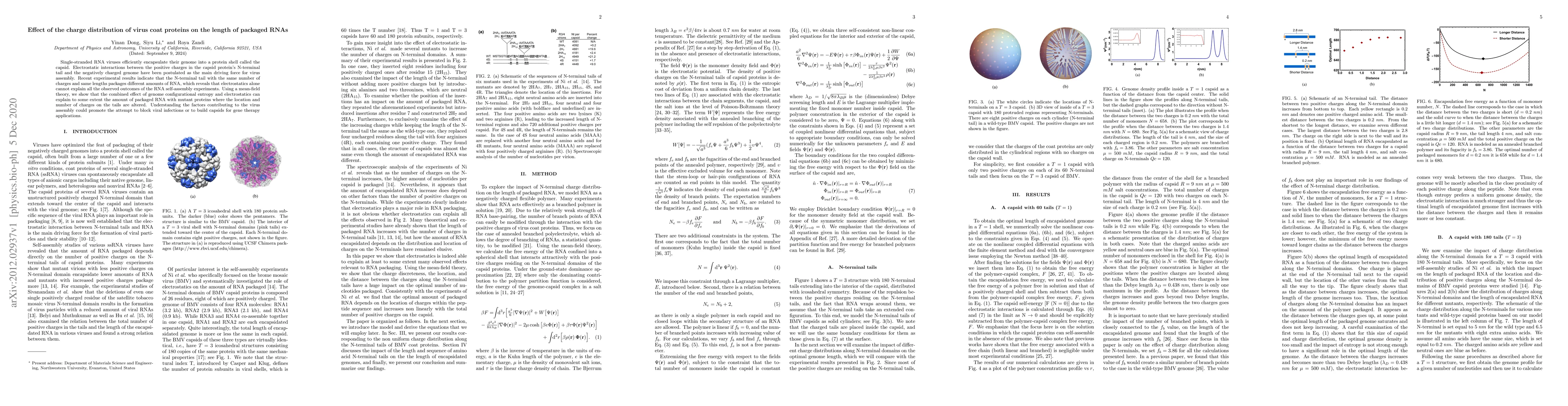 This paper investigates how the charge distribution of virus coat proteins influences the length of packaged RNAs, finding that electrostatics alone does not fully explain RNA assembly. A mean-field theory reveals that genome configurational entropy and electrostatics together better account for RNA packaging variations.