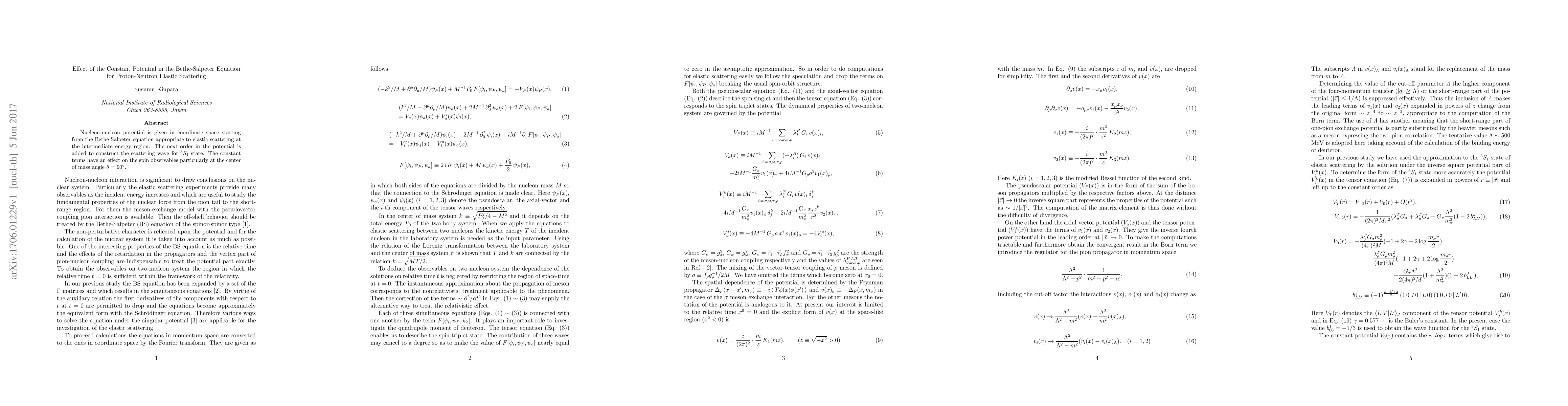 This paper explores the impact of constant potential terms in the Bethe-Salpeter equation on proton-neutron elastic scattering, particularly affecting spin observables at $\theta=90^{\circ}$ in the ${}^3S_1$ state. The study constructs nucleon-nucleon potentials from the Bethe-Salpeter equation and includes higher-order potentials.