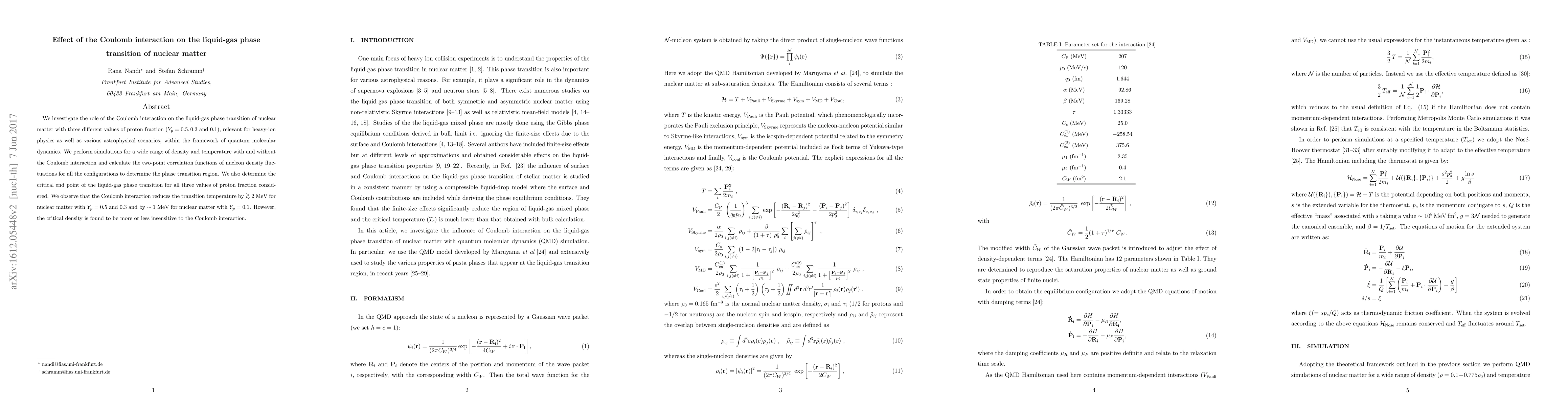 We investigate the role of the Coulomb interaction on the liquid-gas phase transition of nuclear matter with three different values of proton fraction ($Y_p$=0.5,0.3 and 0.1), relevant for heavy-ion physics as well as various astrophysical scenarios, within the framework of quantum molecular dynamics. We perform simulations for a wide range of density and temperature with and without the Coulomb interaction and calculate the two-point correlation functions of nucleon density fluctuations for all the configurations to determine the phase transition region. We also determine the critical end point of the liquid-gas phase transition for all three values of proton fraction considered. We observe that the Coulomb interaction reduces the transition temperature by about 2 MeV for nuclear matter with $Y_p$=0.5 and 0.3 and by about 1 MeV for nuclear matter with $Y_p$=0.1. However, the critical density is found to be more or less insensitive to the Coulomb interaction.