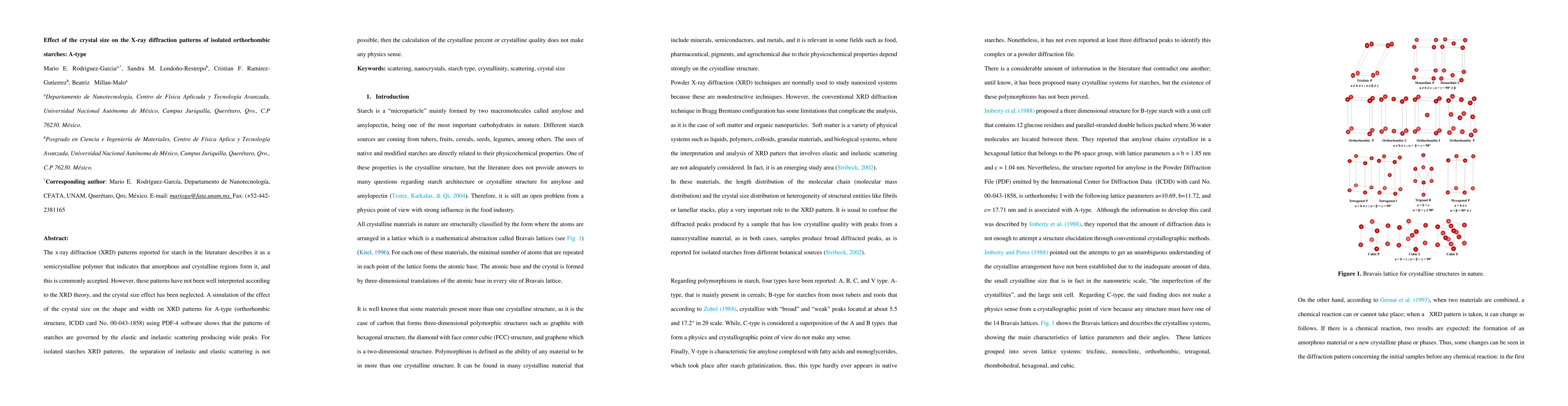 The x-ray diffraction (XRD) patterns reported for starch in the literature describes it as a semicrystalline polymer that indicates that amorphous and crystalline regions form it, and this is commonly accepted. However, these patterns have not been well interpreted according to the XRD theory, and the crystal size effect has been neglected. A simulation of the effect of the crystal size on the shape and width on XRD patterns for A-type (orthorhombic structure, ICDD card No. 00-043-1858) using PDF-4 software shows that the patterns of starches are governed by the elastic and inelastic scattering producing wide peaks. For isolated starches XRD patterns, the separation of inelastic and elastic scattering is not possible, then the calculation of the crystalline percent or crystalline quality does not make any physics sense.
