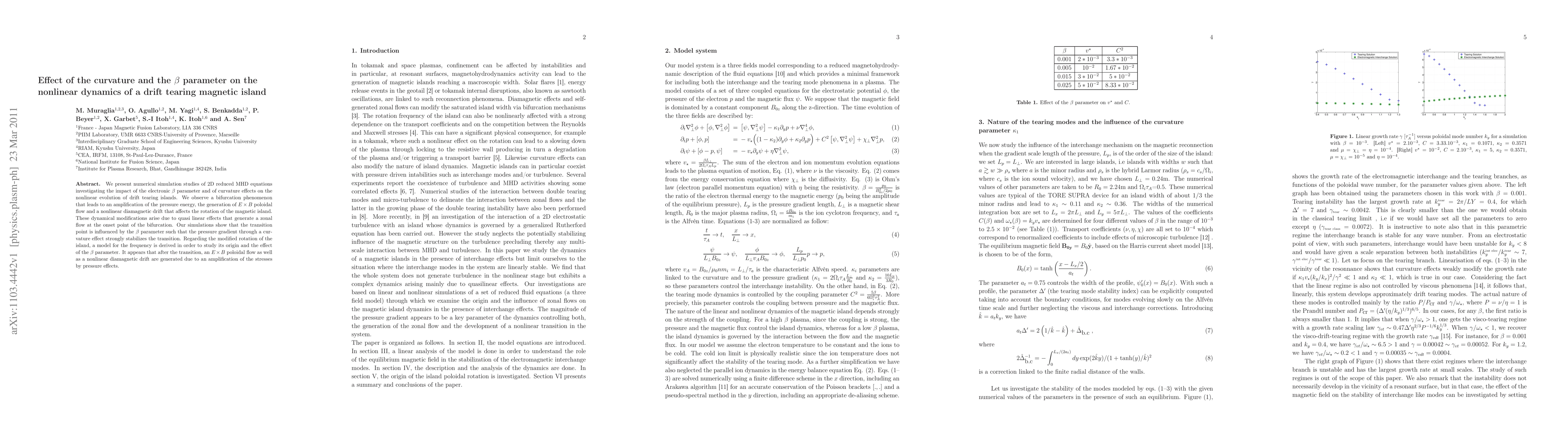We present numerical simulation studies of 2D reduced MHD equations investigating the impact of the electronic \beta parameter and of curvature effects on the nonlinear evolution of drift tearing islands. We observe a bifurcation phenomenon that leads to an amplification of the pressure energy, the generation of E \times B poloidal flow and a nonlinear diamagnetic drift that affects the rotation of the magnetic island. These dynamical modifications arise due to quasilinear effects that generate a zonal flow at the onset point of the bifurcation. Our simulations show that the transition point is influenced by the \beta parameter such that the pressure gradient through a curvature effect strongly stabilizes the transition. Regarding the modified rotation of the island, a model for the frequency is derived in order to study its origin and the effect of the \beta parameter. It appears that after the transition, an E \times B poloidal flow as well as a nonlinear diamagnetic drift are generated due to an amplification of the stresses by pressure effects.