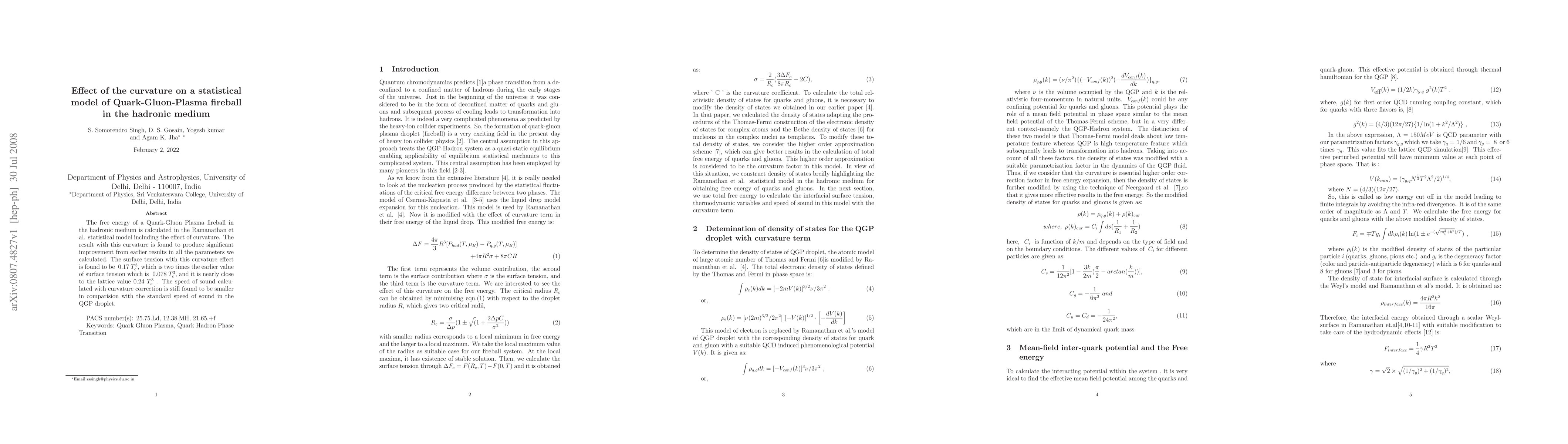 The free energy of a Quark-Gluon Plasma fireball in the hadronic medium is calculated in the Ramanathan et al. statistical model including the effect of curvature. The result with this curvature is found to produce significant improvement from earlier results in all the parameters we calculated. The surface tension with this curvature effect is found to be $ 0.17 T_{c}^{3}$, which is two times the earlier value of surface tension which is $ 0.078 T_{c}^{3} $, and it is nearly close to the lattice value $0.24 T_{c}^{3} $. The speed of sound calculated with curvature correction is still found to be smaller in comparision with the standard speed of sound in the QGP droplet.