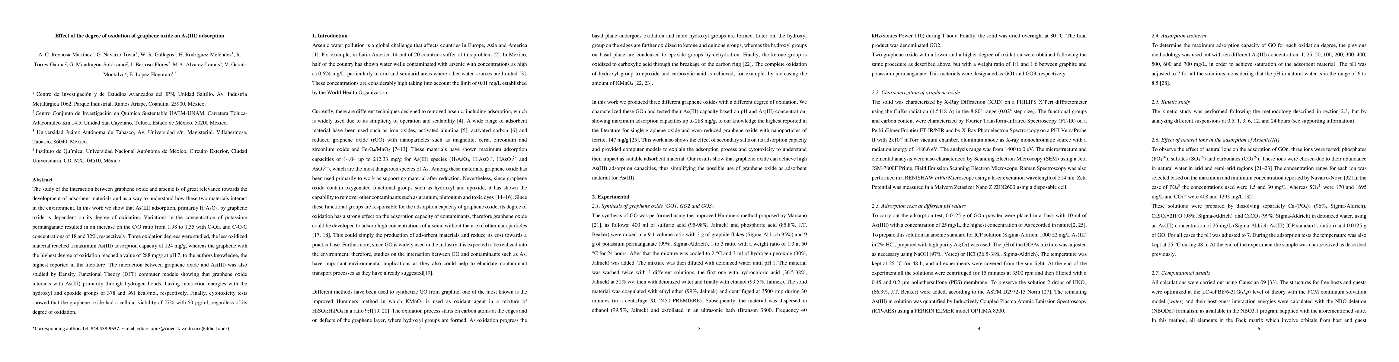 The study reveals that the degree of oxidation in graphene oxide significantly affects its As(III) adsorption capacity, with higher oxidation leading to greater adsorption up to 288 mg/g. DFT models indicate that hydrogen bonds with hydroxyl and epoxide groups facilitate this interaction.