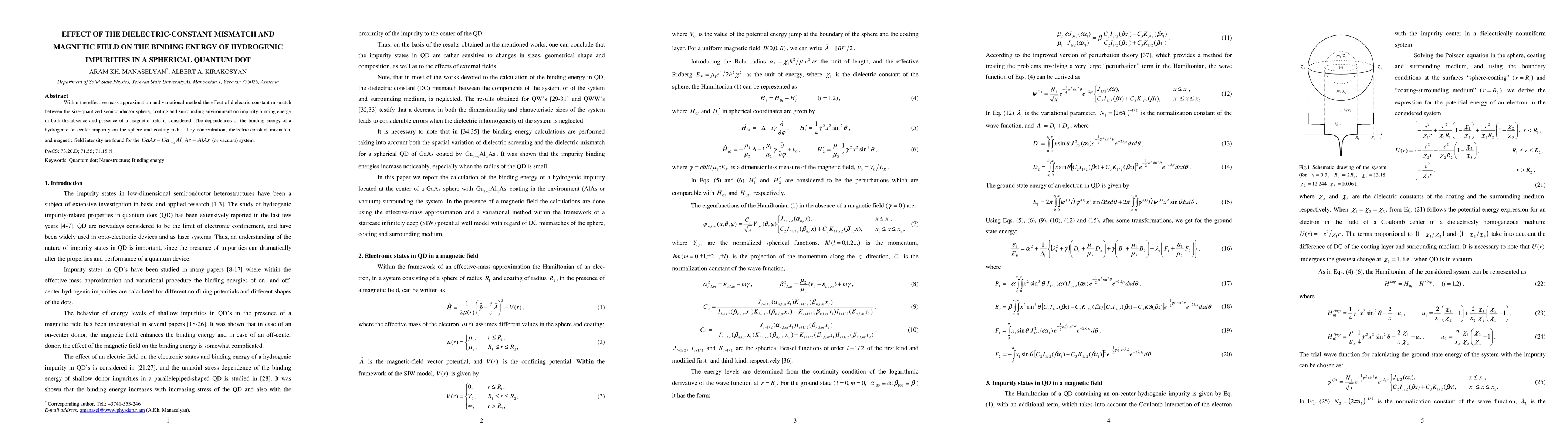 This paper investigates how dielectric-constant mismatch and magnetic fields affect the binding energy of hydrogenic impurities in spherical quantum dots using effective mass approximation and variational methods. It finds dependencies of impurity binding energy on various parameters including sphere and coating radii, alloy concentration, and magnetic field intensity in the GaAs-Ga_(1-x)Al_(x)As-AlAs system.