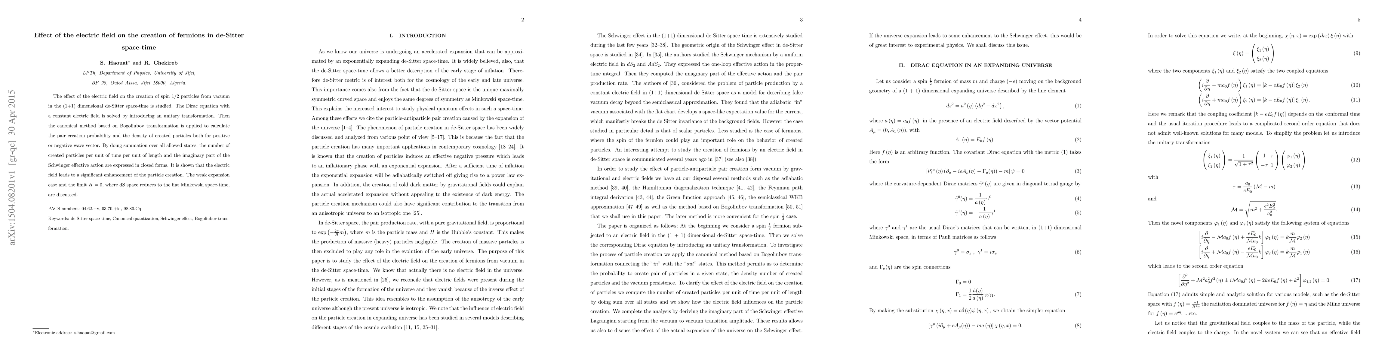This paper investigates the impact of a constant electric field on the creation of spin 1/2 particles in (1+1) dimensional de-Sitter space-time using the Dirac equation and Bogoliubov transformation. The study reveals a significant enhancement in particle creation due to the electric field, with results expressed in closed forms for the number of created particles and the Schwinger effective action.