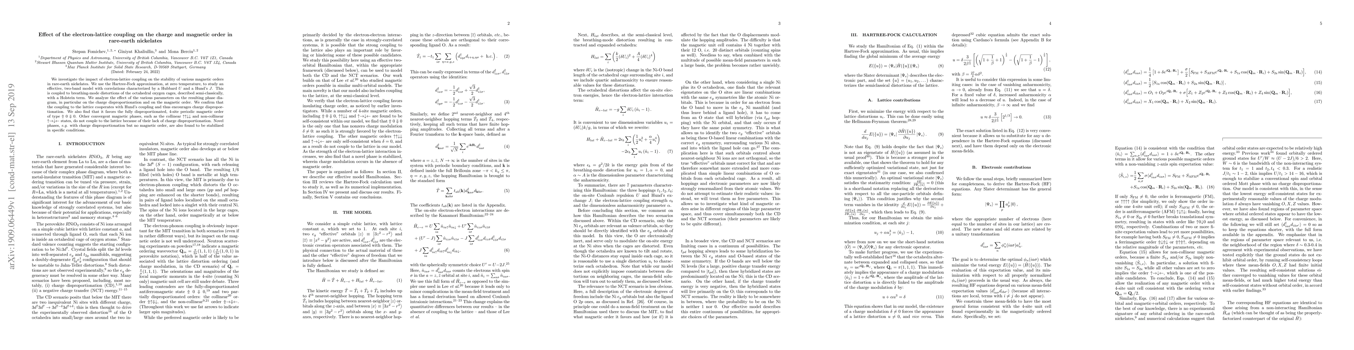 We investigate the impact of electron-lattice coupling on the stability of various magnetic orders in rare-earth nickelates. We use the Hartree-Fock approximation, at zero temperature, to study an effective, two-band model with correlations characterized by a Hubbard $U$ and a Hund's $J$. This is coupled to breathing-mode distortions of the octahedral oxygen cages, described semi-classically, with a Holstein term. We analyze the effect of the various parameters on the resulting phase diagram, in particular on the charge disproportionation and on the magnetic order. We confirm that the coupling to the lattice cooperates with Hund's coupling and thus encourages charge disproportionation. We also find that it favors the fully disproportionated, 4-site periodic magnetic order of type $\Uparrow 0 \Downarrow 0$. Other convergent magnetic phases, such as the collinear $\uparrow\uparrow\downarrow\downarrow$ and non-collinear $\uparrow\rightarrow\downarrow\leftarrow$ states, do not couple to the lattice because of their lack of charge disproportionation. Novel phases, e.g. with charge disproportionation but no magnetic order, are also found to be stabilized in specific conditions.