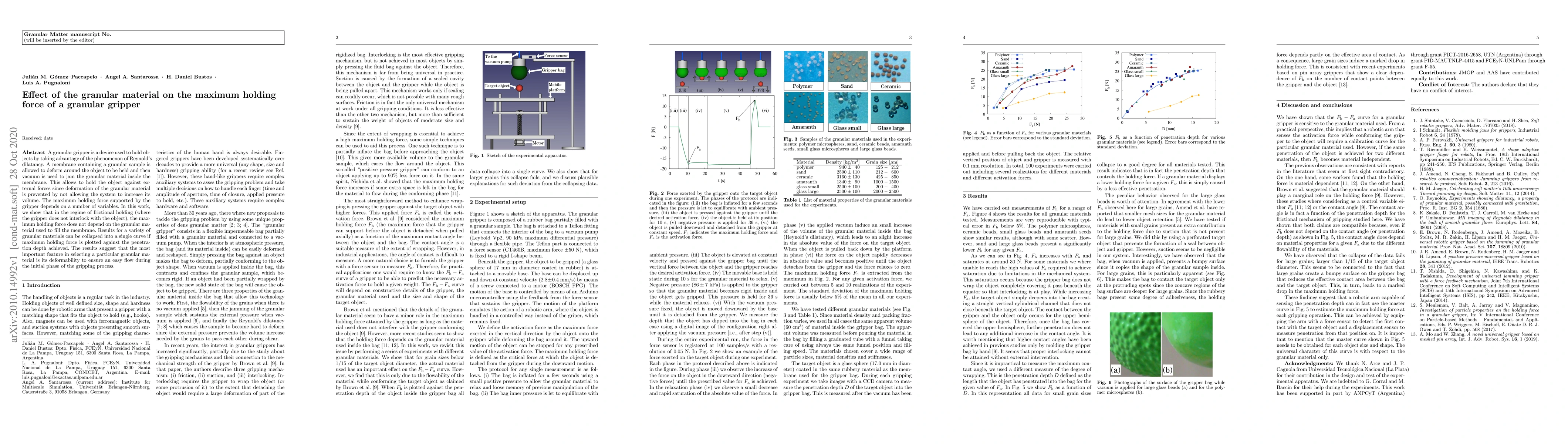 This study investigates the effect of different granular materials on the maximum holding force of a granular gripper, finding that in frictional holding regimes, the maximum holding force is independent of the granular material and can be represented by a single curve when plotted against penetration depth. The key factor for material selection is its deformability for smooth initial gripping.