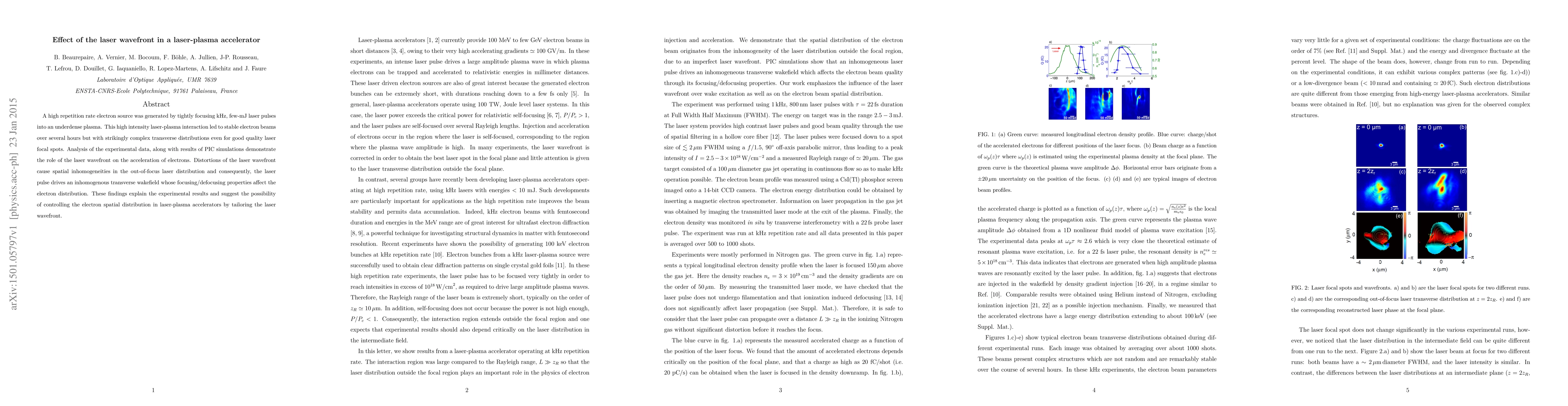 A high repetition rate electron source was generated by tightly focusing kHz, few-mJ laser pulses into an underdense plasma. This high intensity laser-plasma interaction led to stable electron beams over several hours but with strikingly complex transverse distributions even for good quality laser focal spots. Analysis of the experimental data, along with results of PIC simulations demonstrate the role of the laser wavefront on the acceleration of electrons. Distortions of the laser wavefront cause spatial inhomogeneities in the out-of-focus laser distribution and consequently, the laser pulse drives an inhomogenous transverse wakefield whose focusing/defocusing properties affect the electron distribution. These findings explain the experimental results and suggest the possibility of controlling the electron spatial distribution in laser-plasma accelerators by tailoring the laser wavefront.