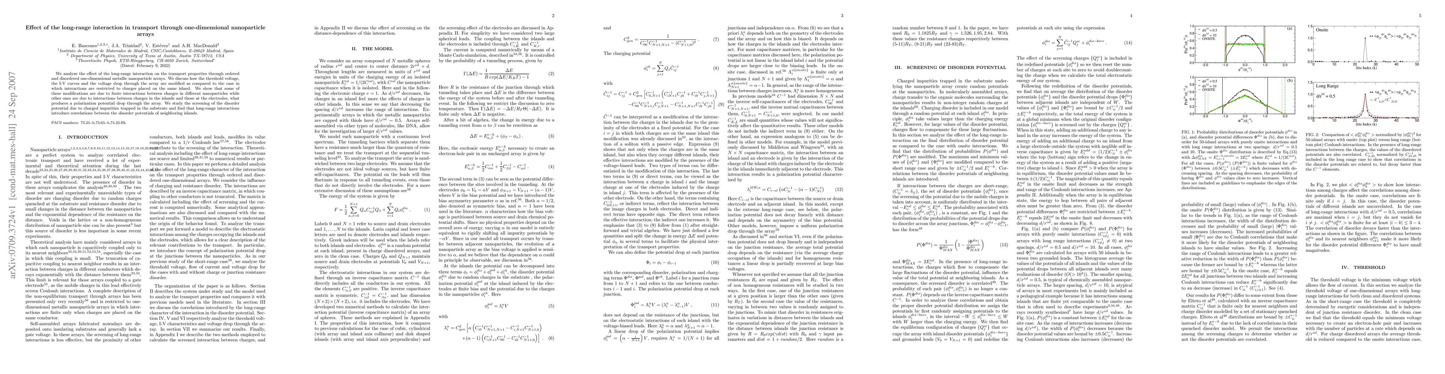 This paper investigates how long-range interactions affect transport properties in one-dimensional metallic nanoparticle arrays, revealing modifications in threshold voltage, I-V curves, and voltage drop due to both inter-nanoparticle and electrode-nanoparticle interactions, leading to polarization potential drops and disorder potential screening.