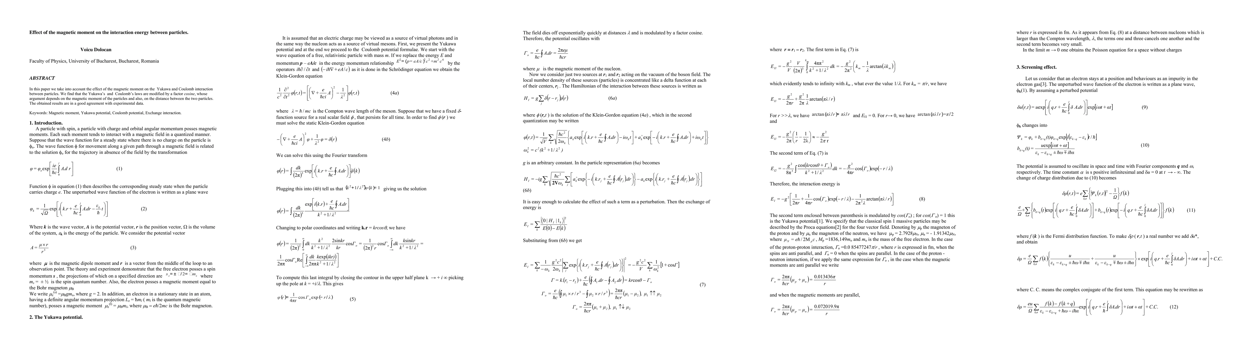 Research finds that a magnetic moment affects the interaction energy between particles, modifying Yukawa and Coulomb laws with a cosine function; results agree with experimental data in ferromagnetism.