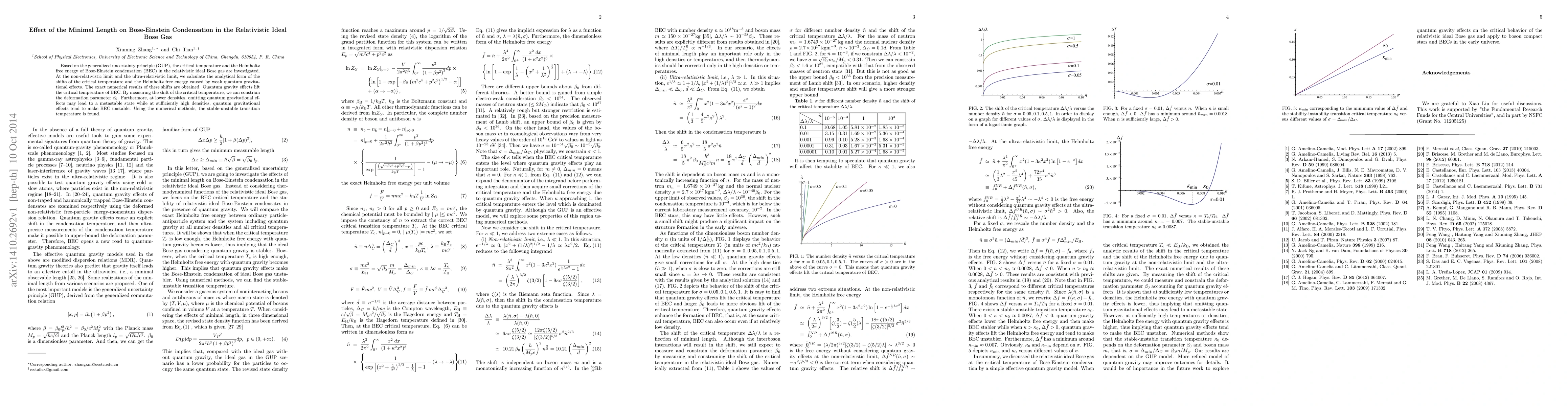 This paper investigates the influence of minimal length from the generalized uncertainty principle on Bose-Einstein condensation in a relativistic ideal Bose gas, finding that quantum gravitational effects increase the critical temperature and determine the stability of the condensate, with numerical methods identifying the transition temperature between stable and metastable states.
