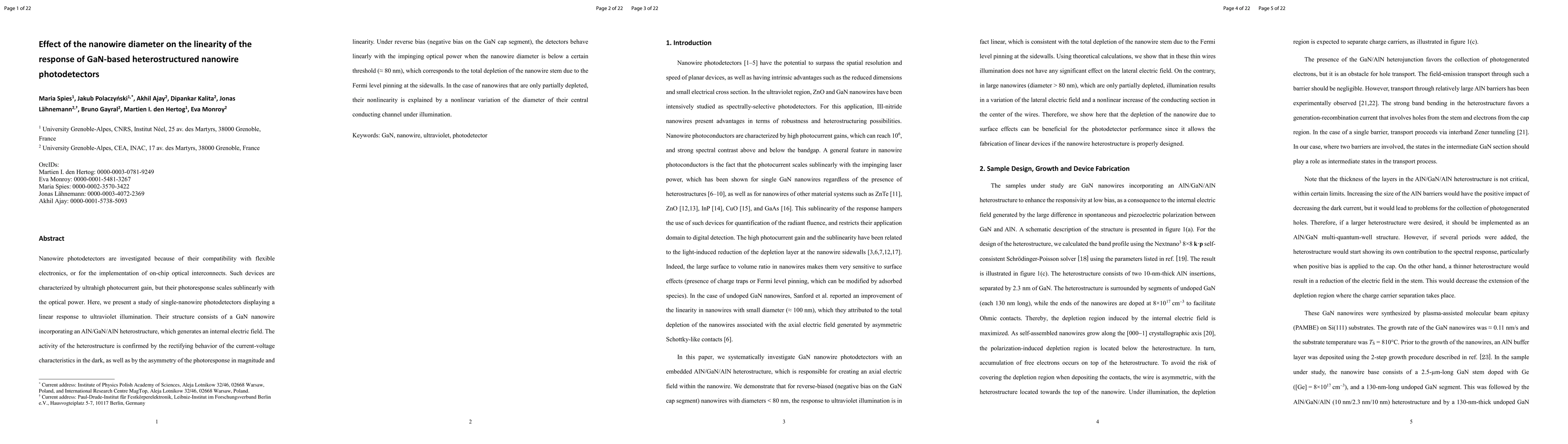 This study investigates GaN-based heterostructured nanowire photodetectors, finding that their response to ultraviolet light is linear when the nanowire diameter is below 80 nm, due to complete depletion of the nanowire stem. Larger diameters cause nonlinearity due to a change in the central conducting channel's diameter under illumination.