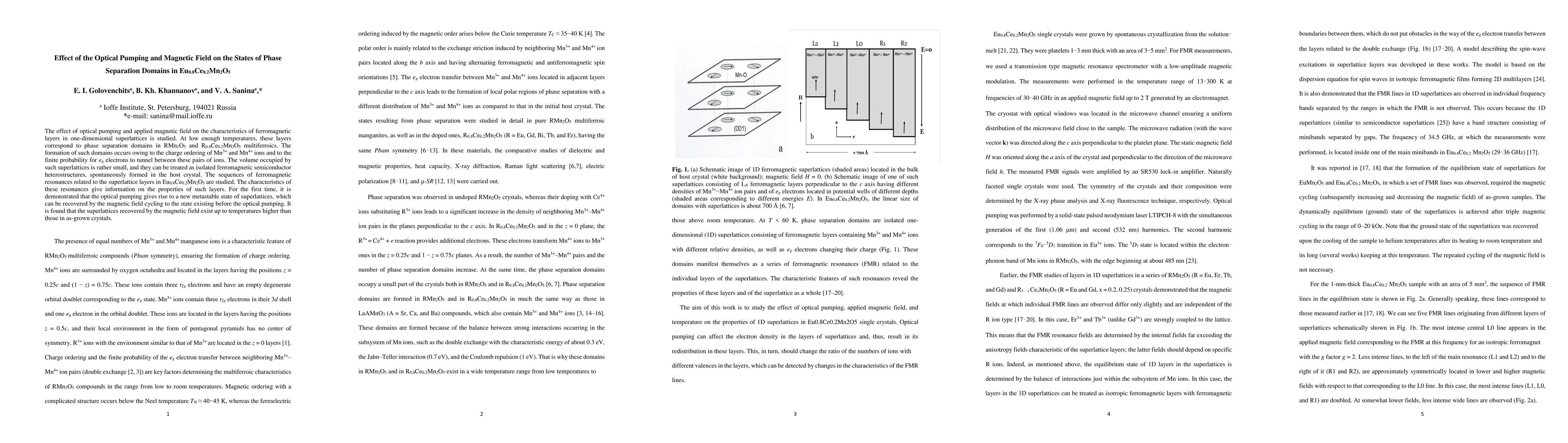 The effect of optical pumping and applied magnetic field on the characteristics of ferromagnetic layers in one-dimensional superlattices is studied. At low enough temperatures, these layers correspond to phase separation domains in RMn_2O_5 and R_{0.8}Ce_{0.2}Mn_2O_5 multiferroics. The formation of such domains occurs owing to the charge ordering of Mn^{3+} and Mn^{4+} ions and to the finite probability for e_g electrons to tunnel between these pairs of ions. The volume occupied by such superlattices is rather small, and they can be treated as isolated ferromagnetic semiconductor heterostructures, spontaneously formed in the host crystal. The sequences of ferromagnetic resonances related to the superlattice layers in Eu_{0.8}Ce_{0.2}Mn_2O_5 are studied. The characteristics of these resonances give information on the properties of such layers. For the first time, it is demonstrated that the optical pumping gives rise to a new metastable state of superlattices, which can be recovered by the magnetic field cycling to the state existing before the optical pumping. It is found that the superlattices recovered by the magnetic field exist up to temperatures higher than those in as-grown crystals.