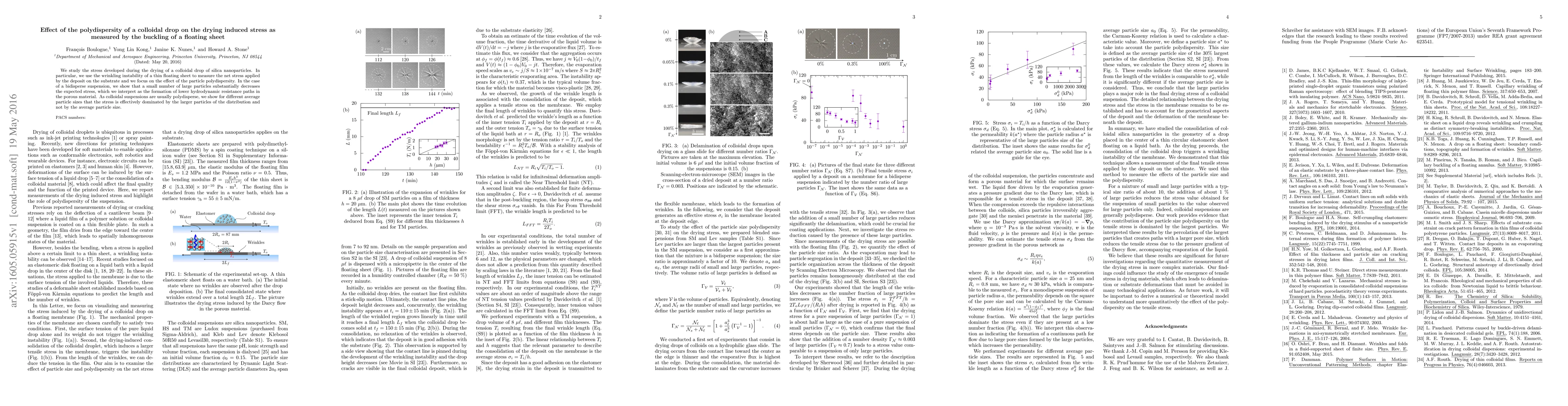 The study found that polydispersity of a colloidal drop affects drying-induced stress measured by sheet buckling. Larger particles in a distribution dominate the stress, not average particle size.