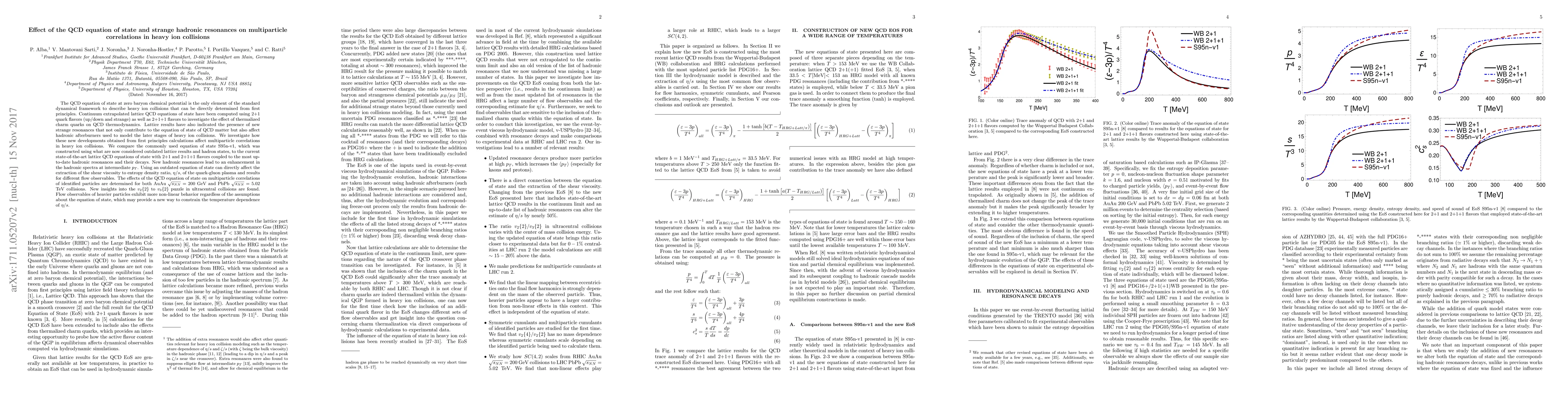 The QCD equation of state at zero baryon chemical potential is the only element of the standard dynamical framework to describe heavy ion collisions that can be directly determined from first principles. Continuum extrapolated lattice QCD equations of state have been computed using 2+1 quark flavors (up/down and strange) as well as 2+1+1 flavors to investigate the effect of thermalized charm quarks on QCD thermodynamics. Lattice results have also indicated the presence of new strange resonances that not only contribute to the equation of state of QCD matter but also affect hadronic afterburners used to model the later stages of heavy ion collisions. We investigate how these new developments obtained from first principles calculations affect multiparticle correlations in heavy ion collisions. We compare the commonly used equation of state S95n-v1, which was constructed using what are now considered outdated lattice results and hadron states, to the current state-of-the-art lattice QCD equations of state with 2+1 and 2+1+1 flavors coupled to the most up-to-date hadronic resonances and their decays. New hadronic resonances lead to an enhancement in the hadronic spectra at intermediate $p_T$. Using an outdated equation of state can directly affect the extraction of the shear viscosity to entropy density ratio, $\eta/s$, of the quark-gluon plasma and results for different flow observables. The effects of the QCD equation of state on multiparticle correlations of identified particles are determined for both AuAu $\sqrt{s_{NN}}=200$ GeV and PbPb $\sqrt{s_{NN}}=5.02$ TeV collisions. New insights into the $v_2\{2\}$ to $v_3\{2\}$ puzzle in ultracentral collisions are found. Flow observables of heavier particles exhibit more non-linear behavior regardless of the assumptions about the equation of state, which may provide a new way to constrain the temperature dependence of $\eta/s$.