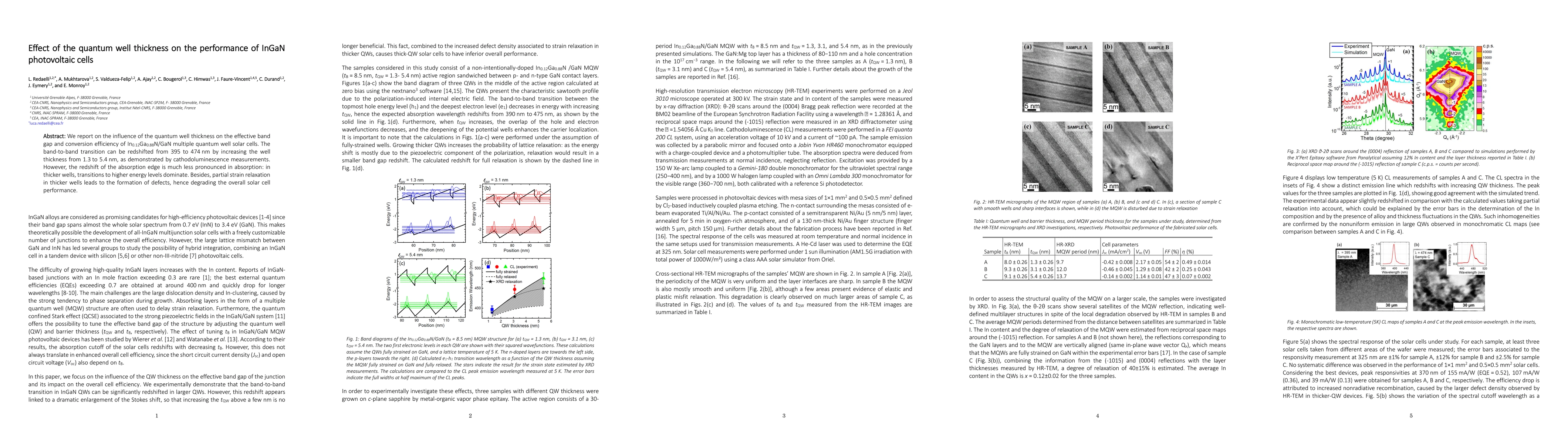 This study investigates how varying quantum well thickness in In0.12Ga0.88N/GaN multiple quantum well solar cells affects the effective band gap and conversion efficiency, finding a redshift in the band-to-band transition but noting that thicker wells lead to defect formation and reduced performance.