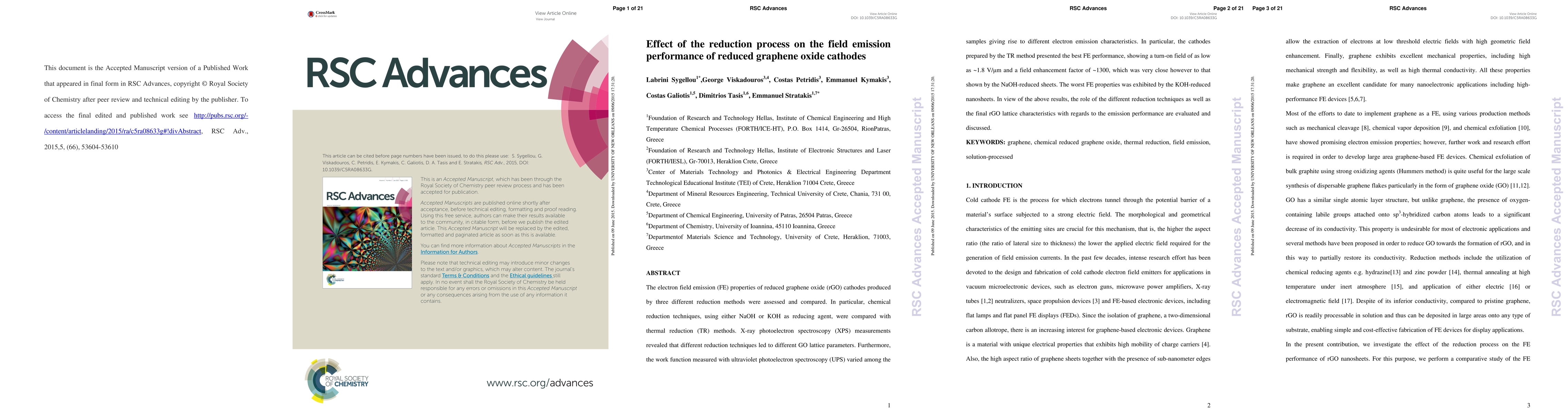 The electron field emission (FE) properties of reduced graphene oxide (rGO) cathodes produced by three different reduction methods were assessed and compared. In particular, chemical reduction techniques, using either NaOH or KOH as reducing agents, were compared with thermal reduction (TR) methods. Xray photoelectron spectroscopy (XPS) measurements revealed that different reduction techniques led to different GO lattice parameters. Furthermore, the work function measured with ultraviolet photoelectron spectroscopy (UPS) varied among the samples giving rise to different electron emission characteristics. In particular, the cathodes prepared by the TR method presented the best FE performance, showing a turnon field of as low as ca. 1.8 V mm^-1 and a field enhancement factor of ca. 1300, which was very close however to that shown by the NaOH-reduced sheets. The worst FE properties were exhibited by the KOH-reduced nanosheets. In light of the above results, the role of the different reduction techniques as well as the final rGO lattice characteristics with regards to the emission performance are evaluated and discussed.