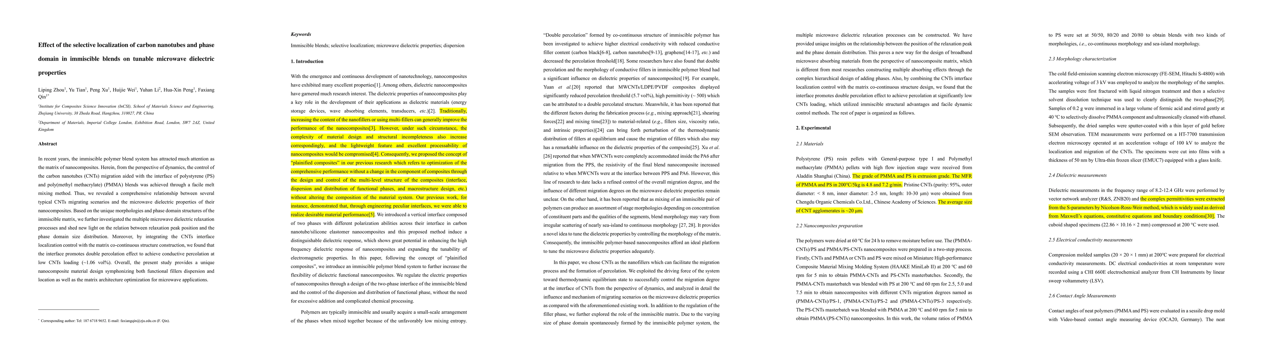 This paper investigates how selectively positioning carbon nanotubes (CNTs) at the interface of polystyrene and poly(methyl methacrylate) blends influences the microwave dielectric properties of nanocomposites. The study reveals a correlation between CNT migration scenarios and dielectric relaxation processes, demonstrating that interface localization can achieve a double percolation effect at low CNT loading, optimizing the material for microwave applications.