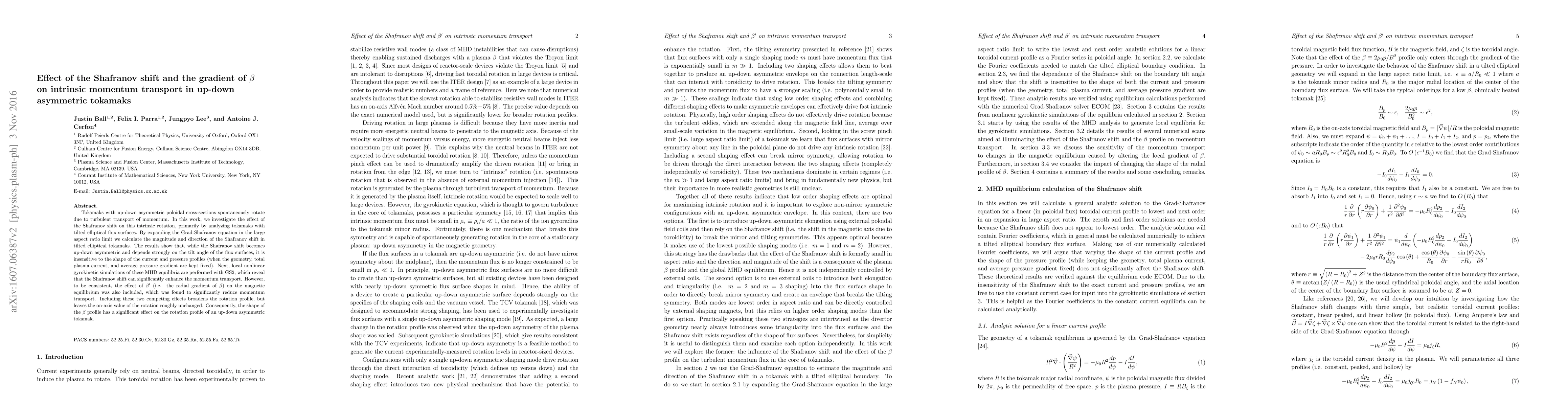 Tokamaks with up-down asymmetric poloidal cross-sections spontaneously rotate due to turbulent transport of momentum. In this work, we investigate the effect of the Shafranov shift on this intrinsic rotation, primarily by analyzing tokamaks with tilted elliptical flux surfaces. By expanding the Grad-Shafranov equation in the large aspect ratio limit we calculate the magnitude and direction of the Shafranov shift in tilted elliptical tokamaks. The results show that, while the Shafranov shift becomes up-down asymmetric and depends strongly on the tilt angle of the flux surfaces, it is insensitive to the shape of the current and pressure profiles (when the geometry, total plasma current, and average pressure gradient are kept fixed). Next, local nonlinear gyrokinetic simulations of these MHD equilibria are performed with GS2, which reveal that the Shafranov shift can significantly enhance the momentum transport. However, to be consistent, the effect of $\beta'$ (i.e. the radial gradient of $\beta$) on the magnetic equilibrium was also included, which was found to significantly reduce momentum transport. Including these two competing effects broadens the rotation profile, but leaves the on-axis value of the rotation roughly unchanged. Consequently, the shape of the $\beta$ profile has a significant effect on the rotation profile of an up-down asymmetric tokamak.