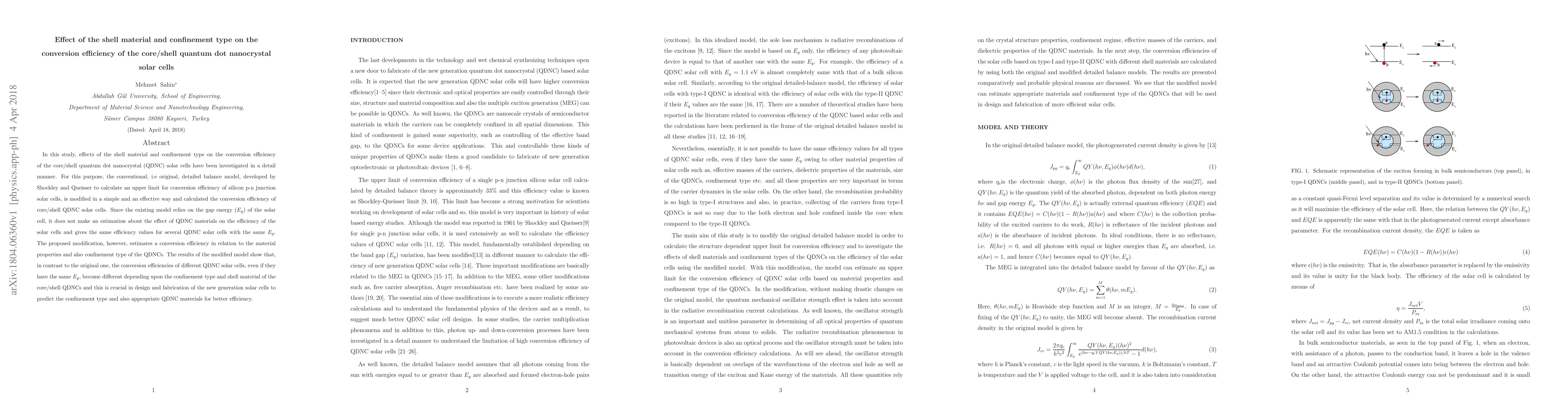 In this study, effects of the shell material and confinement type on the conversion efficiency of the core/shell quantum dot nanocrystal (QDNC) solar cells have been investigated in a detail manner. For this purpose, the conventional, i.e original, detailed balance model, developed by Shockley and Queisser to calculate an upper limit for conversion efficiency of silicon p-n junction solar cells, is modified in a simple and an effective way and calculated the conversion efficiency of core/shell QDNC solar cells. Since the existing model relies on the gap energy ($E_g$) of the solar cell, it does not make an estimation about the effect of QDNC materials on the efficiency of the solar cells and gives the same efficiency values for several QDNC solar cells with the same $E_g$. The proposed modification, however, estimates a conversion efficiency in relation to the material properties and also confinement type of the QDNCs. The results of the modified model show that, in contrast to the original one, the conversion efficiencies of different QDNC solar cells, even if they have the same $E_g$, become different depending upon the confinement type and shell material of the core/shell QDNCs and this is crucial in design and fabrication of the new generation solar cells to predict the confinement type and also appropriate QDNC materials for better efficiency.