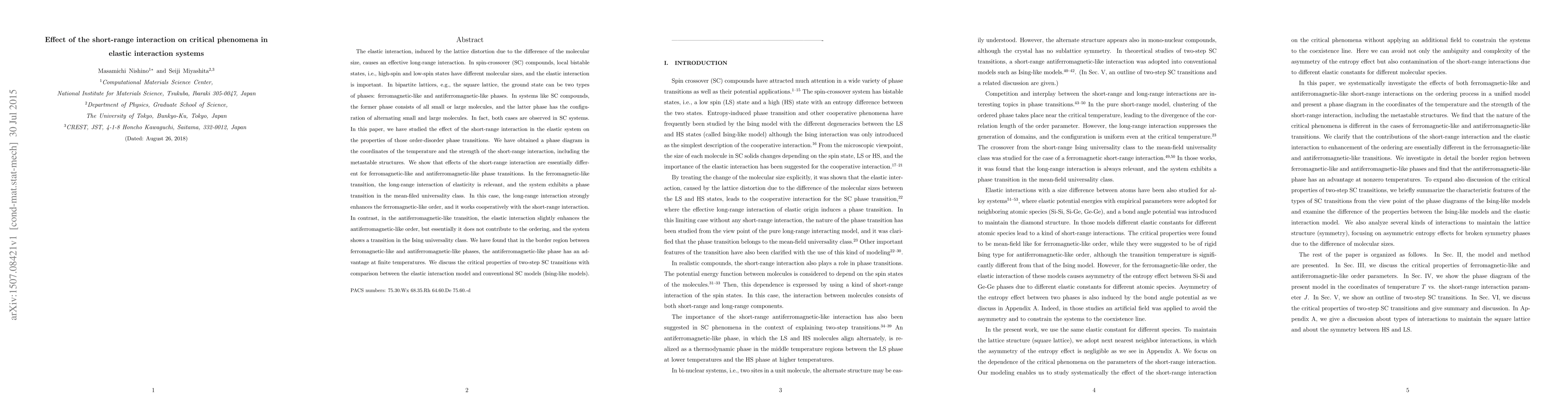 This paper investigates how short-range interactions influence the critical phenomena in elastic interaction systems, particularly in spin-crossover compounds. It reveals distinct effects of short-range interactions on ferromagnetic-like and antiferromagnetic-like phase transitions, showing that elasticity enhances the former but not significantly the latter.