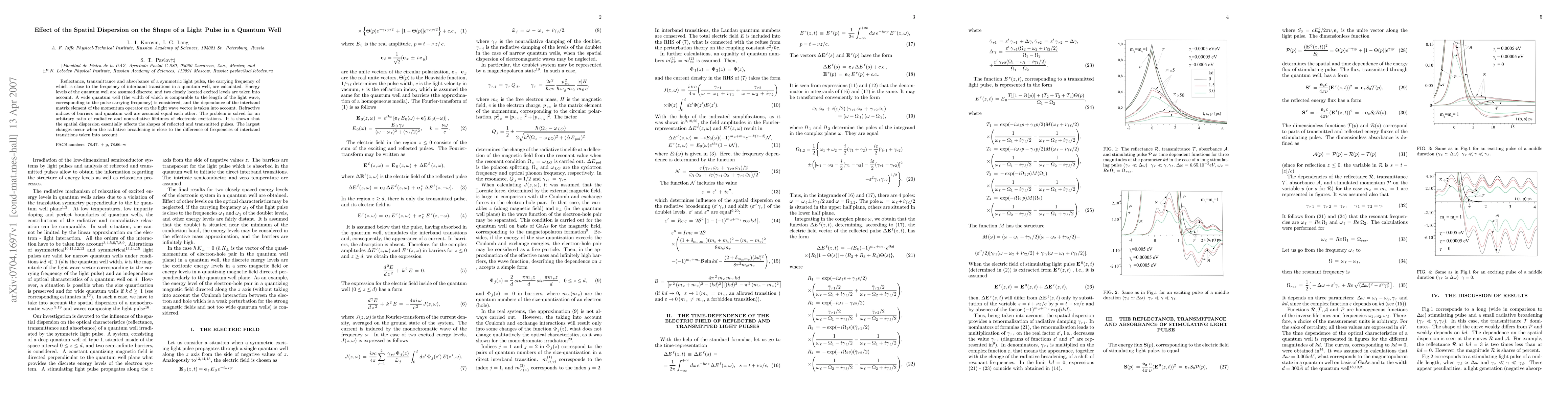 This paper investigates how spatial dispersion influences the shape of a light pulse in a quantum well, finding significant effects on the reflected and transmitted pulses, especially when radiative broadening aligns with interband transition frequencies. The study considers wide quantum wells and equal refractive indices for barriers and the well.