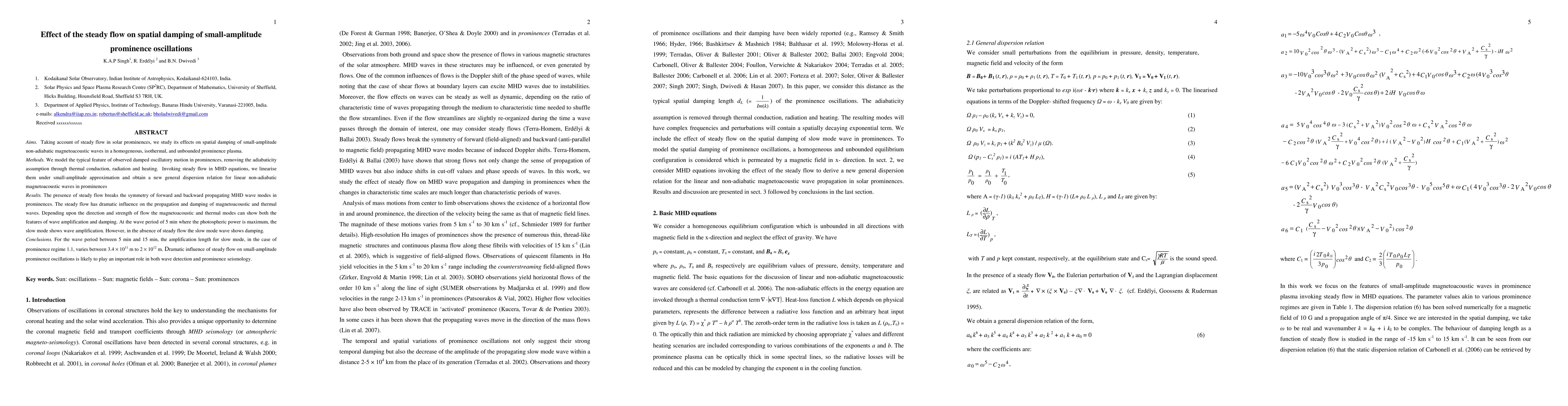 This study investigates the impact of steady flow on the spatial damping of small-amplitude oscillations in solar prominences, revealing that steady flow breaks the symmetry of wave modes and significantly influences wave propagation and damping. The presence of steady flow can lead to both amplification and damping of magnetoacoustic and thermal waves, with notable effects on wave detection and prominence seismology.