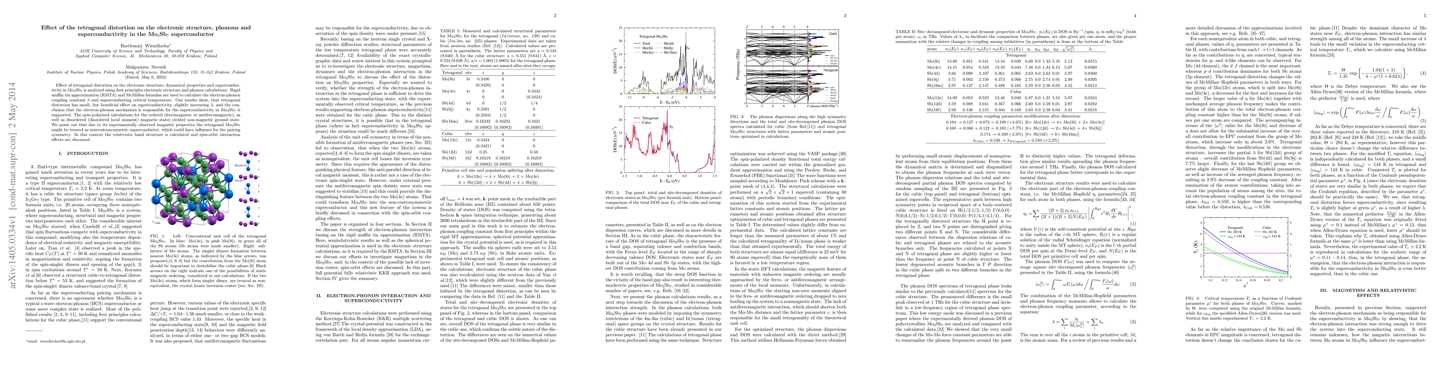 Effect of tetragonal distortion on the electronic structure, dynamical properties and superconductivity in Mo$_3$Sb$_7$ is analyzed using first principles electronic structure and phonon calculations. Rigid muffin tin approximation (RMTA) and McMillan formulas are used to calculate the electron-phonon coupling constant $\lambda$ and superconducting critical temperature. Our results show, that tetragonal distortion has small, but beneficial effect on superconductivity, slightly increasing $\lambda$, and the conclusion that the electron-phonon mechanism is responsible for the superconductivity in Mo$_3$Sb$_7$ is supported. The spin-polarized calculations for the ordered (ferromagnetic or antiferromagnetic), as well as disordered (disordered local moment) magnetic states yielded non-magnetic ground state. We point out that due to its experimentally observed magnetic properties the tetragonal Mo$_3$Sb$_7$ might be treated as noncentrosymmetric superconductor, which could have influence for the pairing symmetry. In this context the relativistic band structure is calculated and spin-orbit interaction effects are discussed.