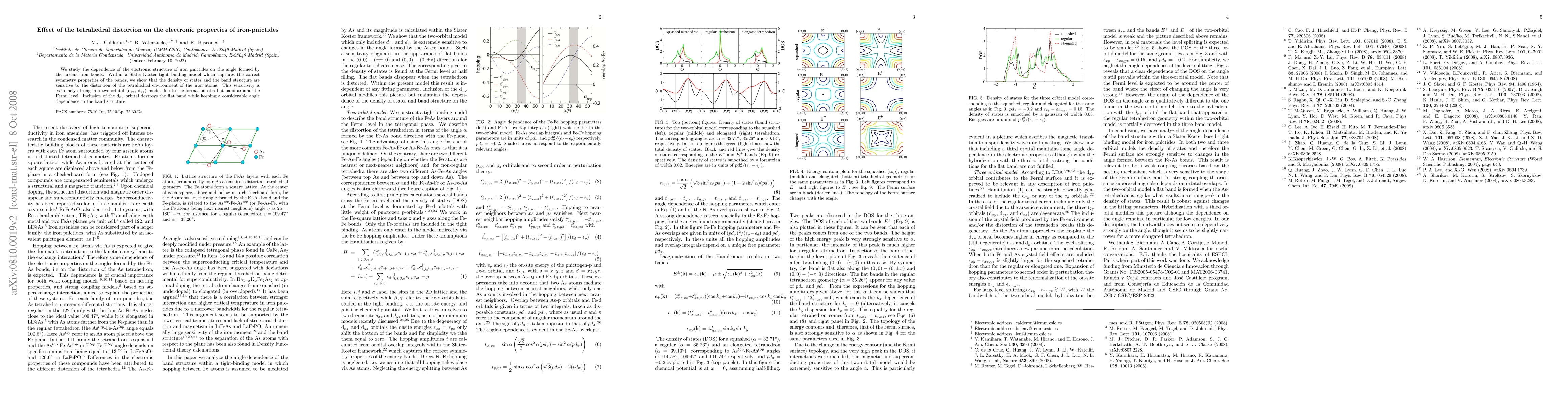 We study the dependence of the electronic structure of iron pnictides on the angle formed by the arsenic-iron bonds. Within a Slater-Koster tight binding model which captures the correct symmetry properties of the bands, we show that the density of states and the band structure are sensitive to the distortion of the tetrahedral environment of the iron atoms. This sensitivity is extremely strong in a two-orbital (d_xz, d_yz) model due to the formation of a flat band around the Fermi level. Inclusion of the d_xy orbital destroys the flat band while keeping a considerable angle dependence in the band structure.