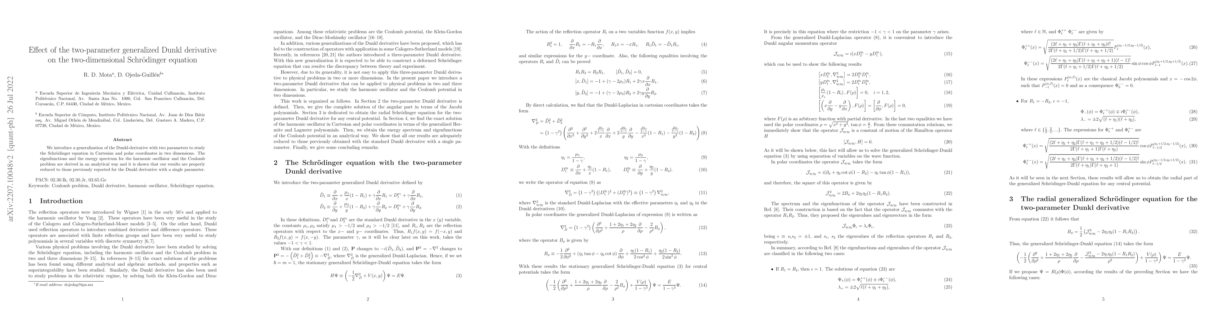 This paper generalizes the Dunkl derivative with two parameters to analyze the two-dimensional Schrödinger equation in Cartesian and polar coordinates. Analytical solutions for the harmonic oscillator and Coulomb problem are derived, showing consistency with single-parameter Dunkl derivative results.
