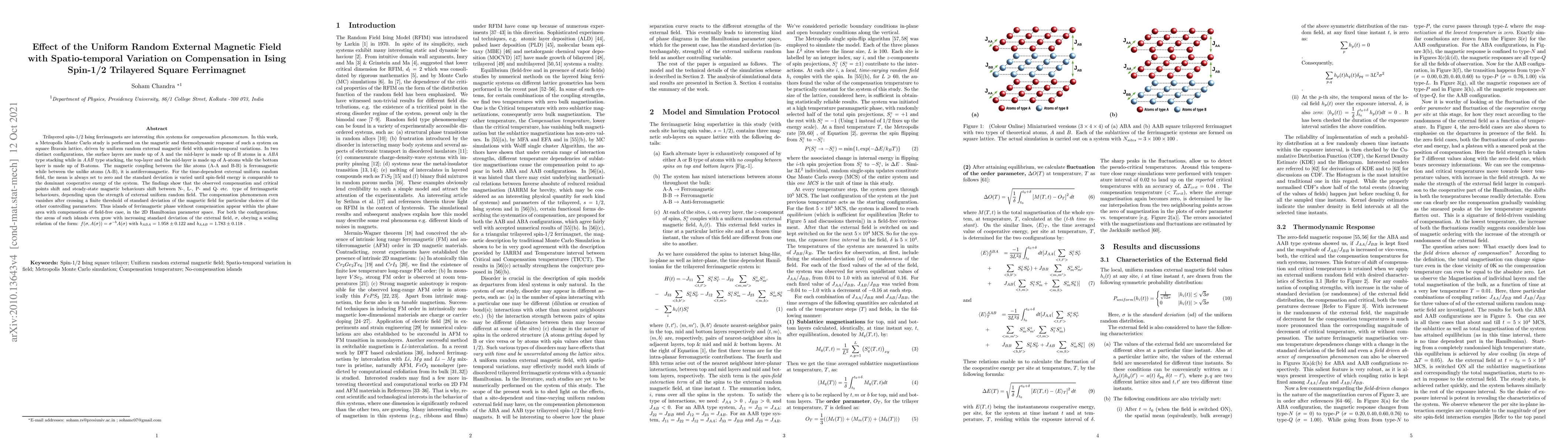 Trilayered spin-1/2 Ising ferrimagnets are interesting thin systems for compensation phenomenon. In this work, a Metropolis Monte Carlo study is performed on the magnetic and thermodynamic response of such a system on square Bravais lattice, driven by uniform random external magnetic field with spatio-temporal variations. In two distinct configurations, the surface layers are made up of A and the mid-layer is made up of B atoms in a ABA type stacking while in AAB type stacking, the top-layer and the mid-layer is made up of A-atoms while the bottom layer is made up of B-atoms. The magnetic coupling between the like atoms (A-A and B-B) is ferromagnetic while between the unlike atoms (A-B), it is antiferromagnetic. For the time-dependent external uniform random field, the mean is always set to zero and the standard deviation is varied until spin-field energy is comparable to the dominant cooperative energy of the system. The findings show that the observed compensation and critical points shift and steady-state magnetic behaviours shift between N-, L-, P- and Q- etc. type of ferrimagnetic behaviours, depending upon the strength of external uniform random field. The compensation phenomenon even vanishes after crossing a finite threshold of standard deviation of the magnetic field for particular choices of the other controlling parameters. Thus islands of ferrimagnetic phase without compensation appear within the phase area with compensation of field-free case, in the 2D Hamiltonian parameter space. For both the configurations, the areas of such islands even grow with increasing standard deviation of the external field, {\sigma}, obeying a scaling relation of the form: $f ({\sigma}, A({\sigma})) = {\sigma}^{-b} A({\sigma})$ with $b_{ABA} = 1.958 \pm 0.122$ and $b_{AAB} = 1.783 \pm 0.118$ .
