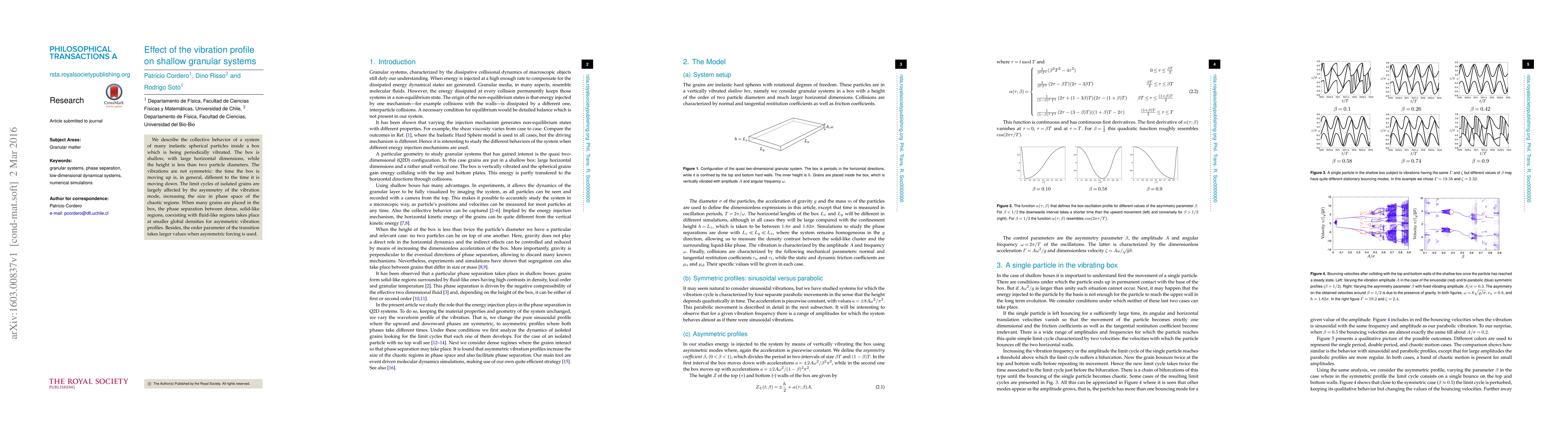 We describe the collective behavior of a system of many inelastic spherical particles inside a box which is being periodically vibrated. The box is shallow, with large horizontal dimensions, while the height is less than two particle diameters. The vibrations are not symmetric: the time the box is moving up is, in general, different to the time it is moving down. The limit cycles of isolated grains are largely affected by the asymmetry of the vibration mode, increasing the size in phase space of the chaotic regions. When many grains are placed in the box, the phase separation between dense, solid-like regions, coexisting with fluid-like regions takes place at smaller global densities for asymmetric vibration profiles. Besides, the order parameter of the transition takes larger values when asymmetric forcing is used.