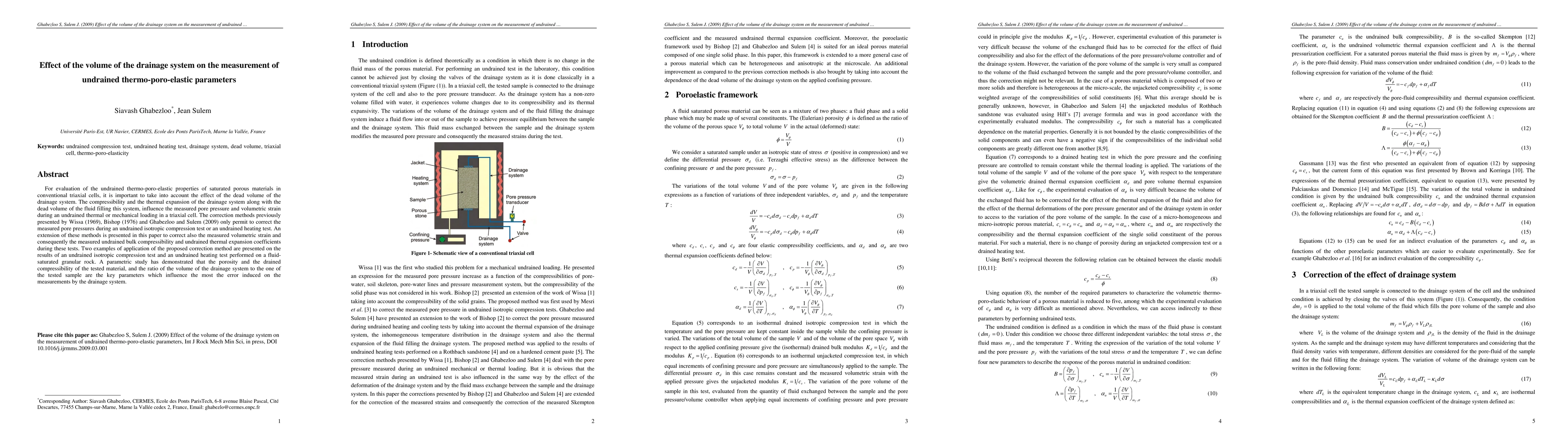 For evaluation of the undrained thermo-poro-elastic properties of saturated porous materials in conventional triaxial cells, it is important to take into account the effect of the dead volume of the drainage system. The compressibility and the thermal expansion of the drainage system along with the dead volume of the fluid filling this system, influence the measured pore pressure and volumetric strain during an undrained thermal or mechanical loading in a triaxial cell. The correction methods previously presented by Wissa (1969), Bishop (1976) and Ghabezloo and Sulem (2009) only permit to correct the measured pore pressures during an undrained isotropic compression test or an undrained heating test. An extension of these methods is presented in this paper to correct also the measured volumetric strain and consequently the measured undrained bulk compressibility and undrained thermal expansion coefficients during these tests. Two examples of application of the proposed correction method are presented on the results of an undrained isotropic compression test and an undrained heating test performed on a fluid-saturated granular rock. A parametric study has demonstrated that the porosity and the drained compressibility of the tested material, and the ratio of the volume of the drainage system to the one of the tested sample are the key parameters which influence the most the error induced on the measurements by the drainage system.