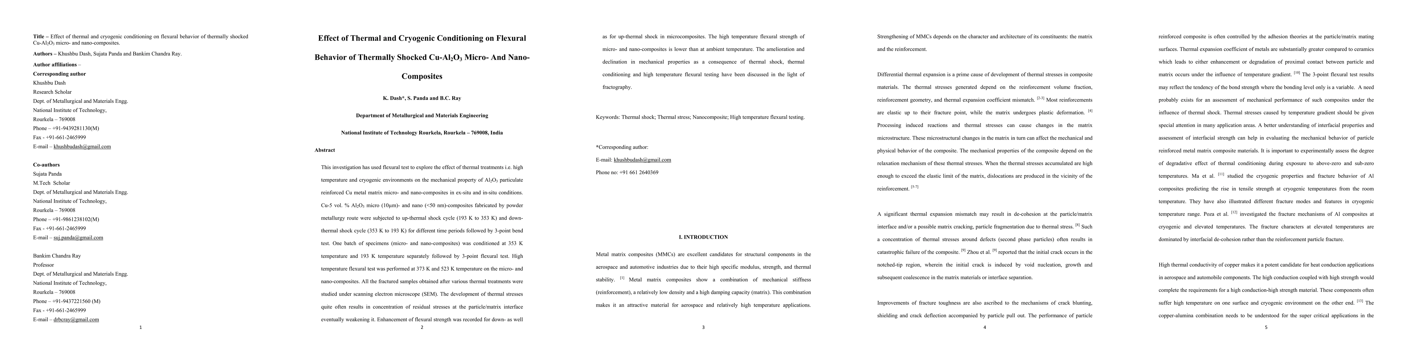 This investigation has used flexural test to explore the effects of thermal treatments, i.e., high-temperature and cryogenic environments on the mechanical property of alumina particulate-reinforced Cu metal matrix micro and nanocomposites in ex-situ and in-situ conditions. Cu-5 vol. pct alumina micro (10 micron)- and nanocomposites (<50 nm) fabricated by powder metallurgy route were subjected to up-thermal shock cycle [193 K to 353 K (-80C to 80C)] and down-thermal shock cycle [193 K to 353 K (from 80C to -80C)] for different time periods followed by 3-point bend test. One batch of specimens (micro and nanocomposites) was conditioned at [193 K to 353 K (from 80C to -80C)] separately followed by 3-point flexural test. High-temperature flexural test was performed at [373 K to 523 K (100C to 250C)] on the micro and nanocomposites. All the fractured samples obtained after various thermal treatments were studied under scanning electron microscope (SEM). The development of thermal stresses quite often results in concentration of residual stresses at the particle/matrix interface eventually weakening it. Enhancement of flexural strength was recorded for down- as well as for up-thermal shock in microcomposites. The high-temperature flexural strengths of micro and nanocomposites are lower than those at ambient temperature. The amelioration and declination in mechanical properties as a consequence of thermal shock, thermal conditioning, and high-temperature flexural testing have been discussed in the light of fractography.