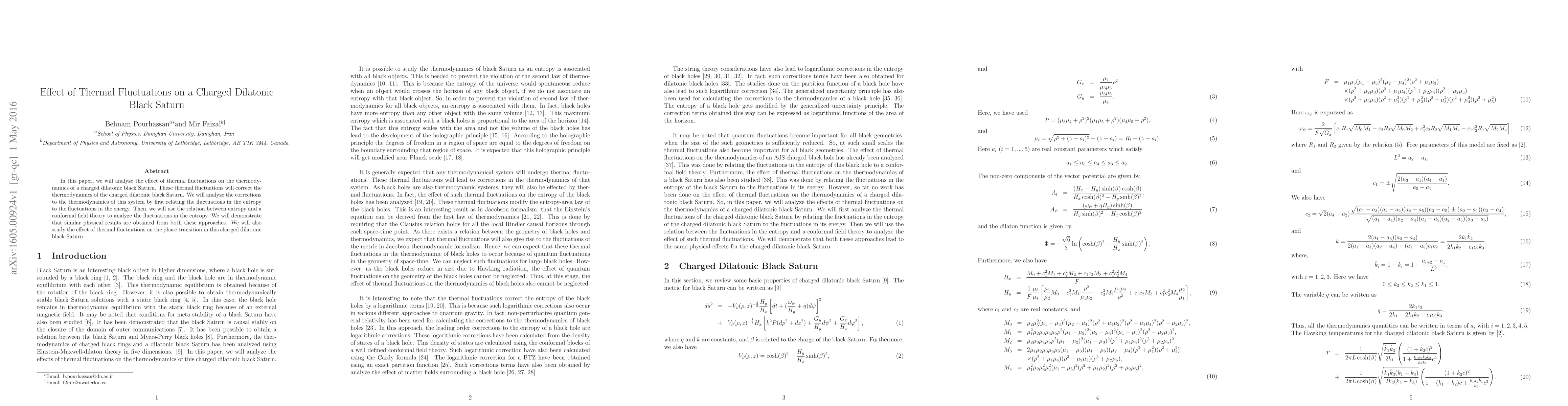 In this paper, we will analyze the effect of thermal fluctuations on the thermodynamics of a charged dilatonic black Saturn. These thermal fluctuations will correct the thermodynamics of the charged dilatonic black Saturn. We will analyze the corrections to the thermodynamics of this system by first relating the fluctuations in the entropy to the fluctuations in the energy. Then, we will use the relation between entropy and a conformal field theory to analyze the fluctuations in the entropy. We will demonstrate that similar physical results are obtained from both these approaches. We will also study the effect of thermal fluctuations on the phase transition in this charged dilatonic black Saturn.