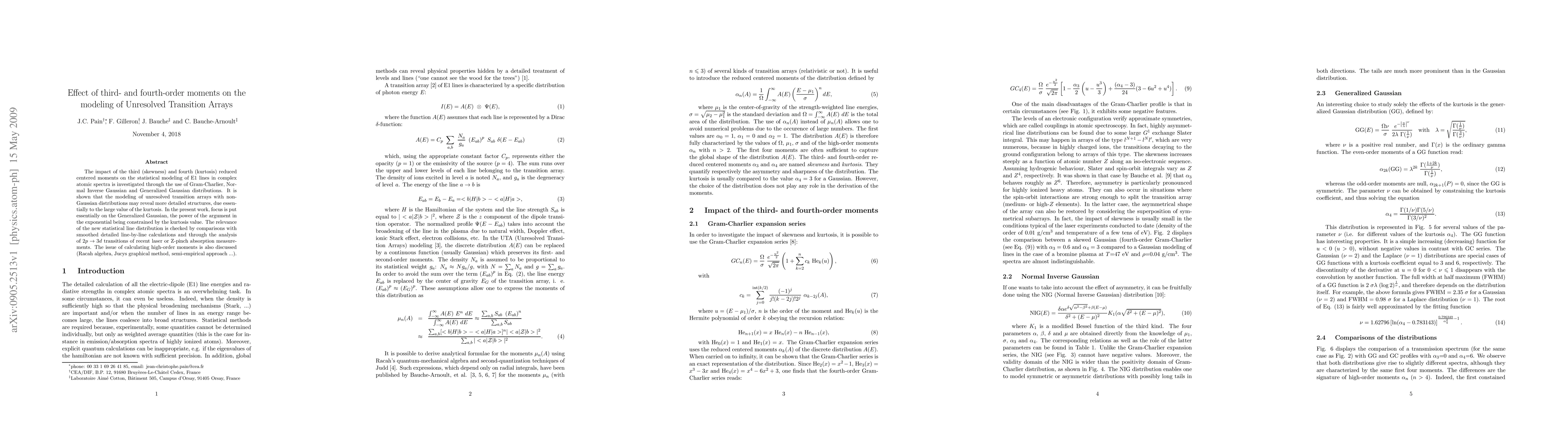 The impact of the third (skewness) and fourth (kurtosis) reduced centered moments on the statistical modeling of E1 lines in complex atomic spectra is investigated through the use of Gram-Charlier, Normal Inverse Gaussian and Generalized Gaussian distributions. It is shown that the modeling of unresolved transition arrays with non-Gaussian distributions may reveal more detailed structures, due essentially to the large value of the kurtosis. In the present work, focus is put essentially on the Generalized Gaussian, the power of the argument in the exponential being constrained by the kurtosis value. The relevance of the new statistical line distribution is checked by comparisons with smoothed detailed line-by-line calculations and through the analysis of 2p-3d transitions of recent laser or Z-pinch absorption measurements. The issue of calculating high-order moments is also discussed (Racah algebra, Jucys graphical method, semi-empirical approach ...).