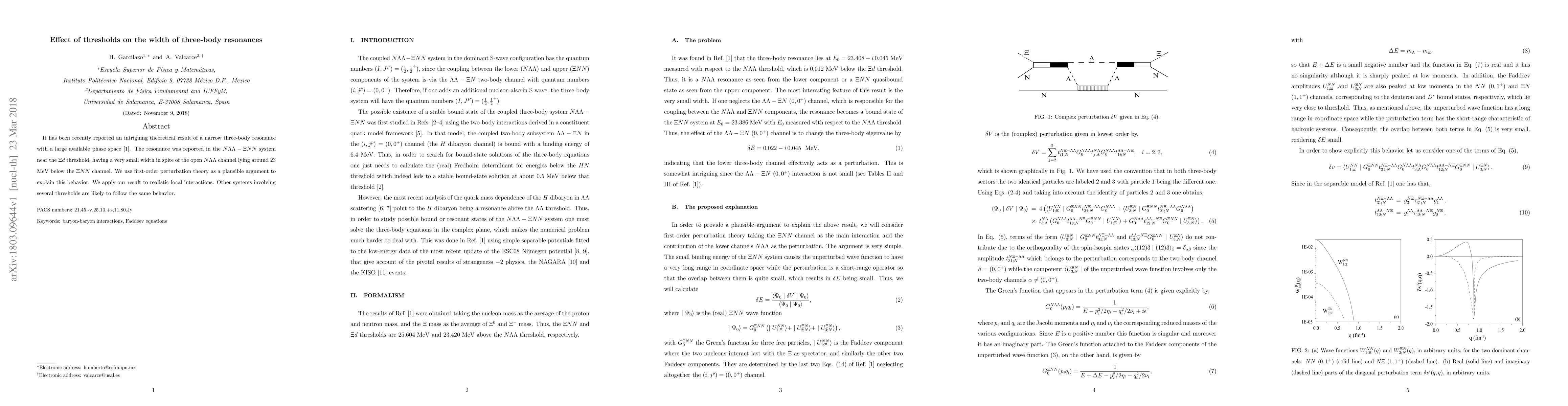 Researchers found that a narrow three-body resonance with a large available phase space can occur near certain thresholds, explaining the unusual behavior using first-order perturbation theory. This phenomenon is expected to be applicable to other systems involving multiple thresholds.